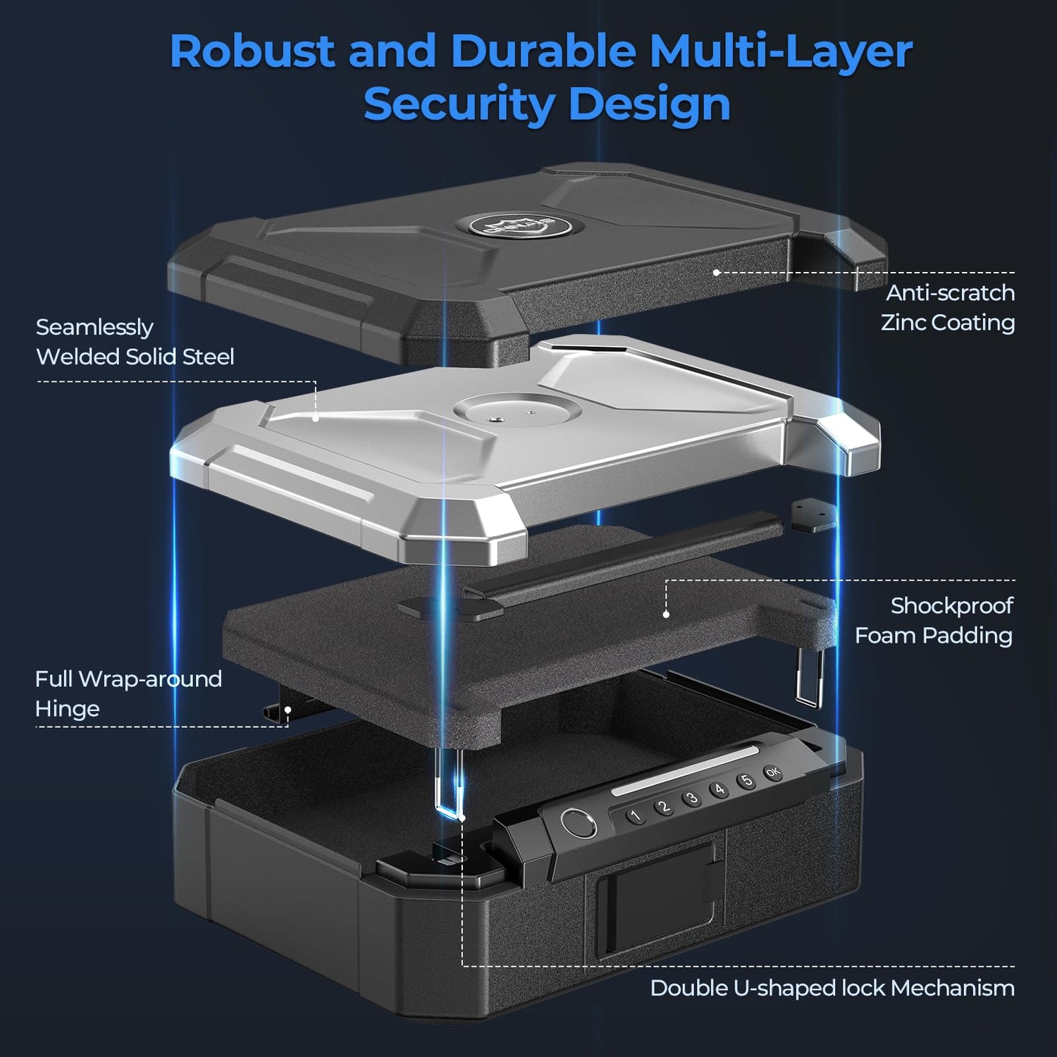 - 【Durable Theft-Proof Structure】A seamlessly welded solid steel body & smooth anti-scratch finish. Virtually impossible to pry open the safe box with hand tools. Reinforced anti-theft heavy duty steel cable and fixing screws can be mounted anywhere. Shockproof foam padding ensures that valuables are protected.