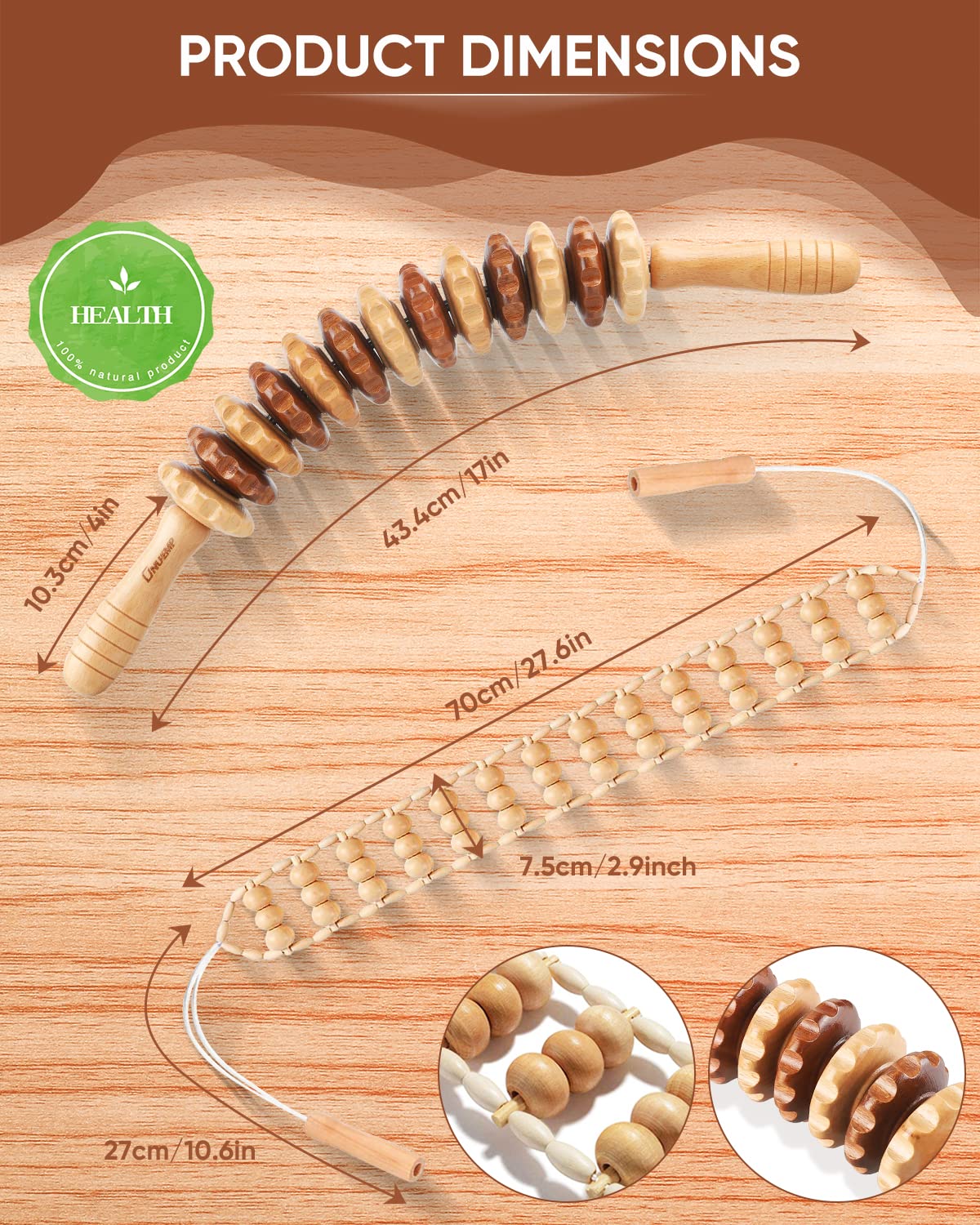 ONUEMP 2PCS Wood Therapy Massage Tools, Wooden Massage Roller Stick & Back Massager Roller Rope, Maderoterapia Kit Colombiana for Lymphatic Drainage, Anti Cellulite, Body Sculpting, Ease Deep Tissue