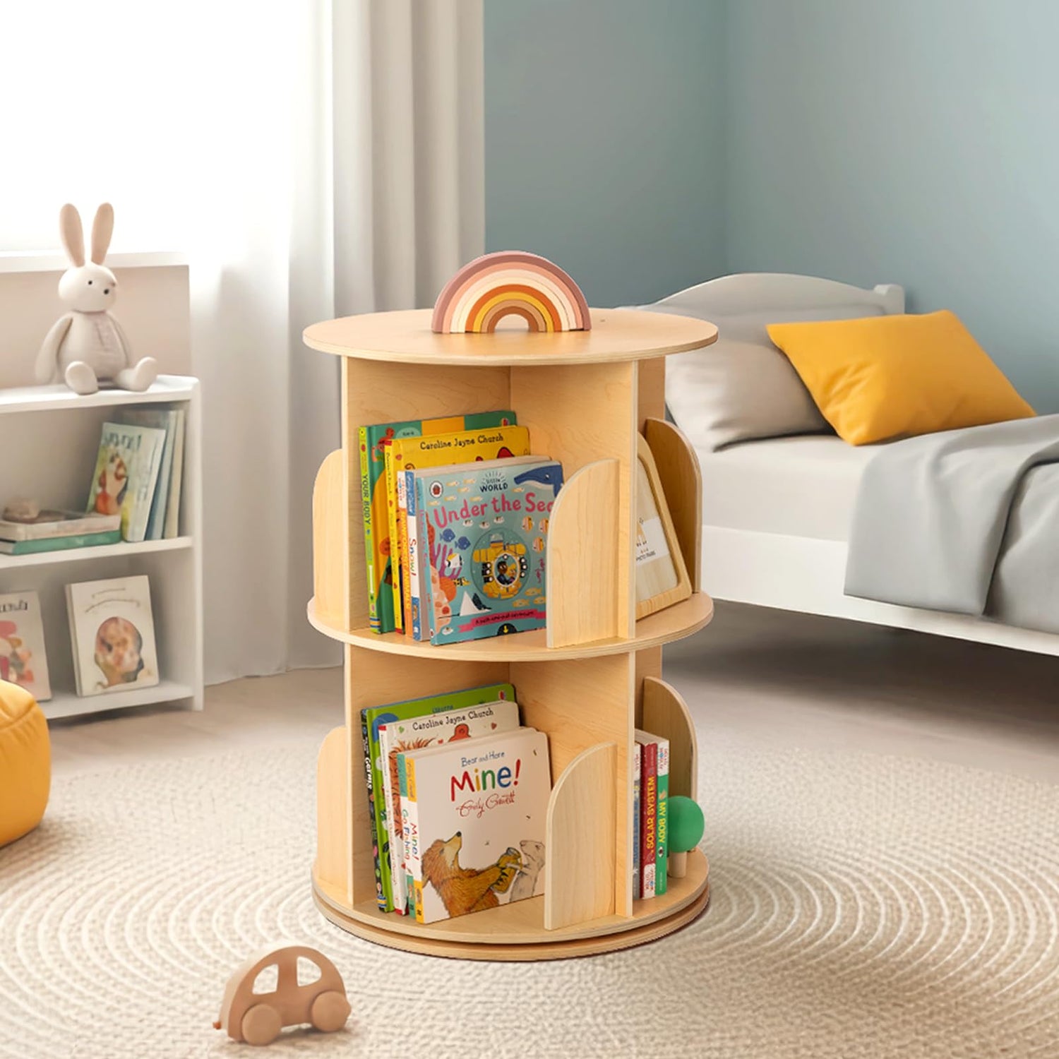 - 360° Rotating Bookcase: 2-layer open rotating bookshelf with 8 small compartments for storing books, decorations, daily necessities, children's toys, etc. It combines practicality and storage