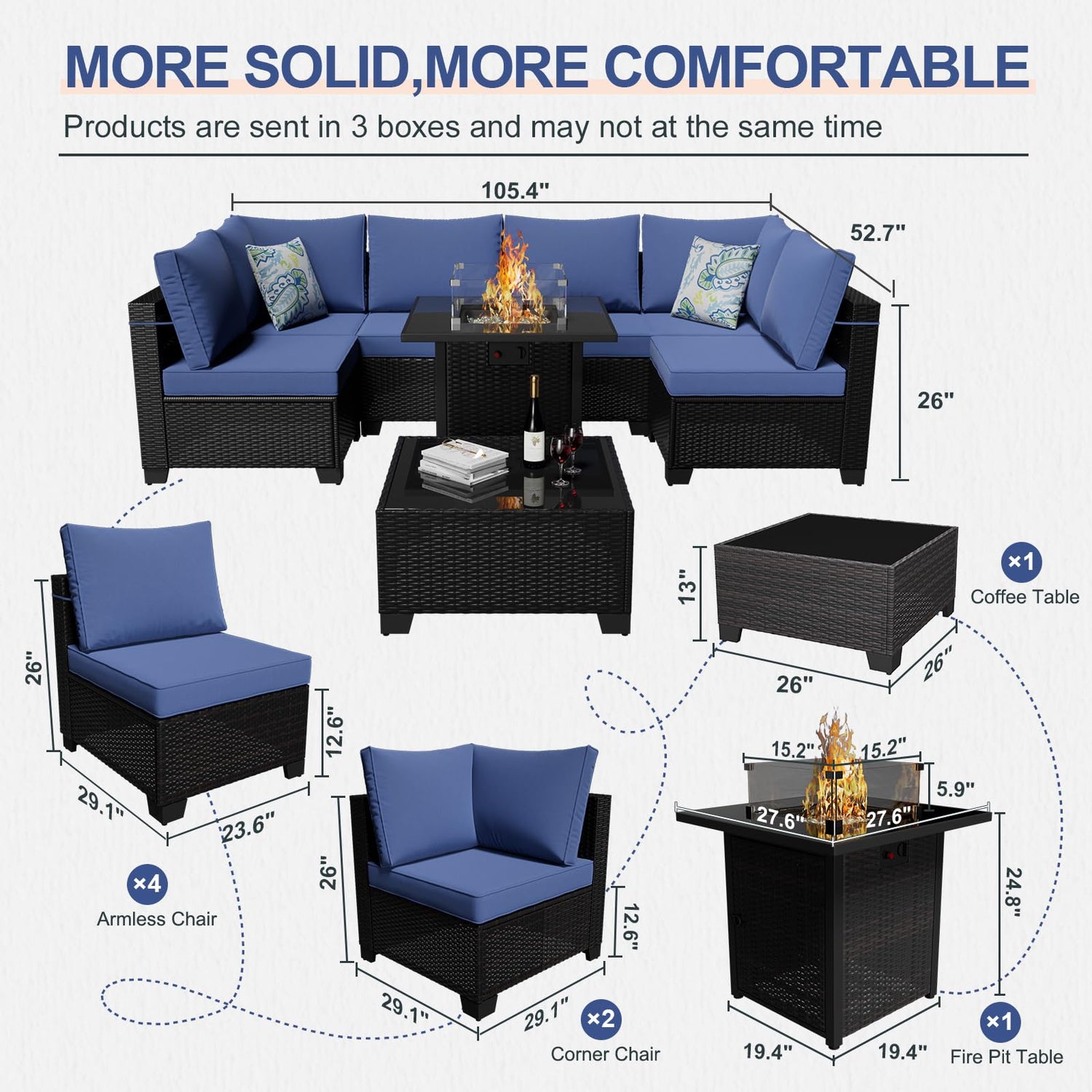 - DURABLE AND STURDY MATERIAL- 8 pieces patio outdoor sectional sofas with fire pit table features a sturdy steel frame. Wicker is strong enough to withstand all weather changes and the weight capacity is 350lbs. Thick waterproof cushion is very easy to clean. Tempered glass for the coffee table also ensures our safety
