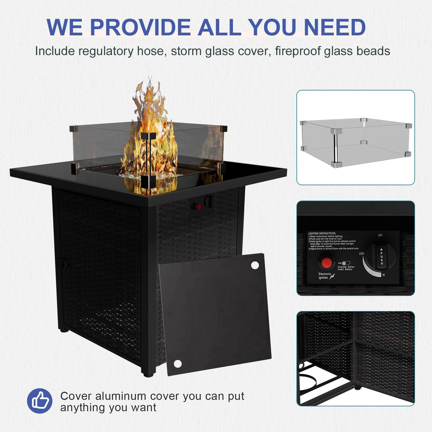 - 28" Fire Pit Set :Using a dual-tube stainless steel burner, the heat output is 50,000 BTU after ignition, ensuring stable and full flame. Propane fuel allows you to no longer suffer from ash and smoke.Four windshields prevent flames from spilling out.Firepit table without grooves, covered with a cover can be used as a dinning table