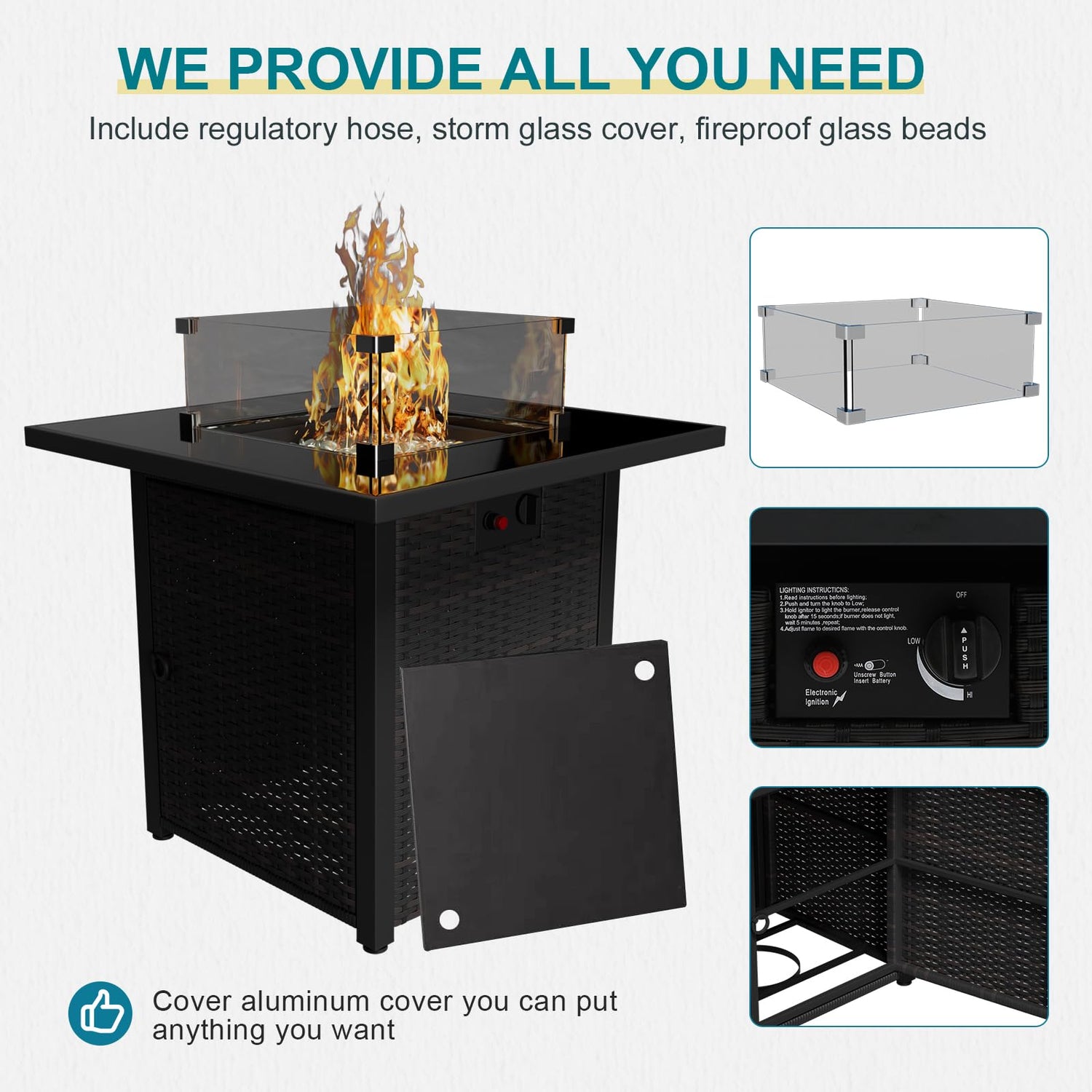 - Secure Fire Pit Set :Using a dual-tube stainless steel burner, the heat output is 50,000 BTU after ignition, ensuring stable and full flame. Propane fuel allows you to no longer suffer from ash and smoke.Four windshields prevent flames from spilling out.Firepit table without grooves, covered with a cover can be used as a dinning table