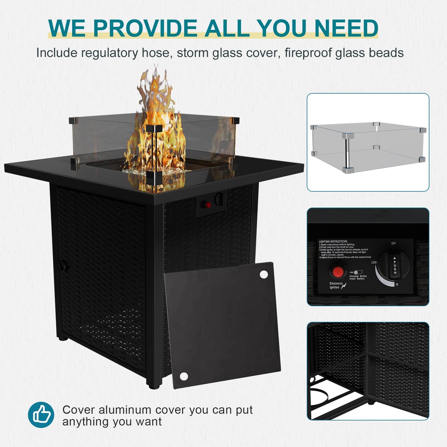- 28" Fire Pit Set :Using a dual-tube stainless steel burner, the heat output is 50,000 BTU after ignition, ensuring stable and full flame. Propane fuel allows you to no longer suffer from ash and smoke.Four windshields prevent flames from spilling out.Firepit table without grooves, covered with a cover can be used as a dinning table