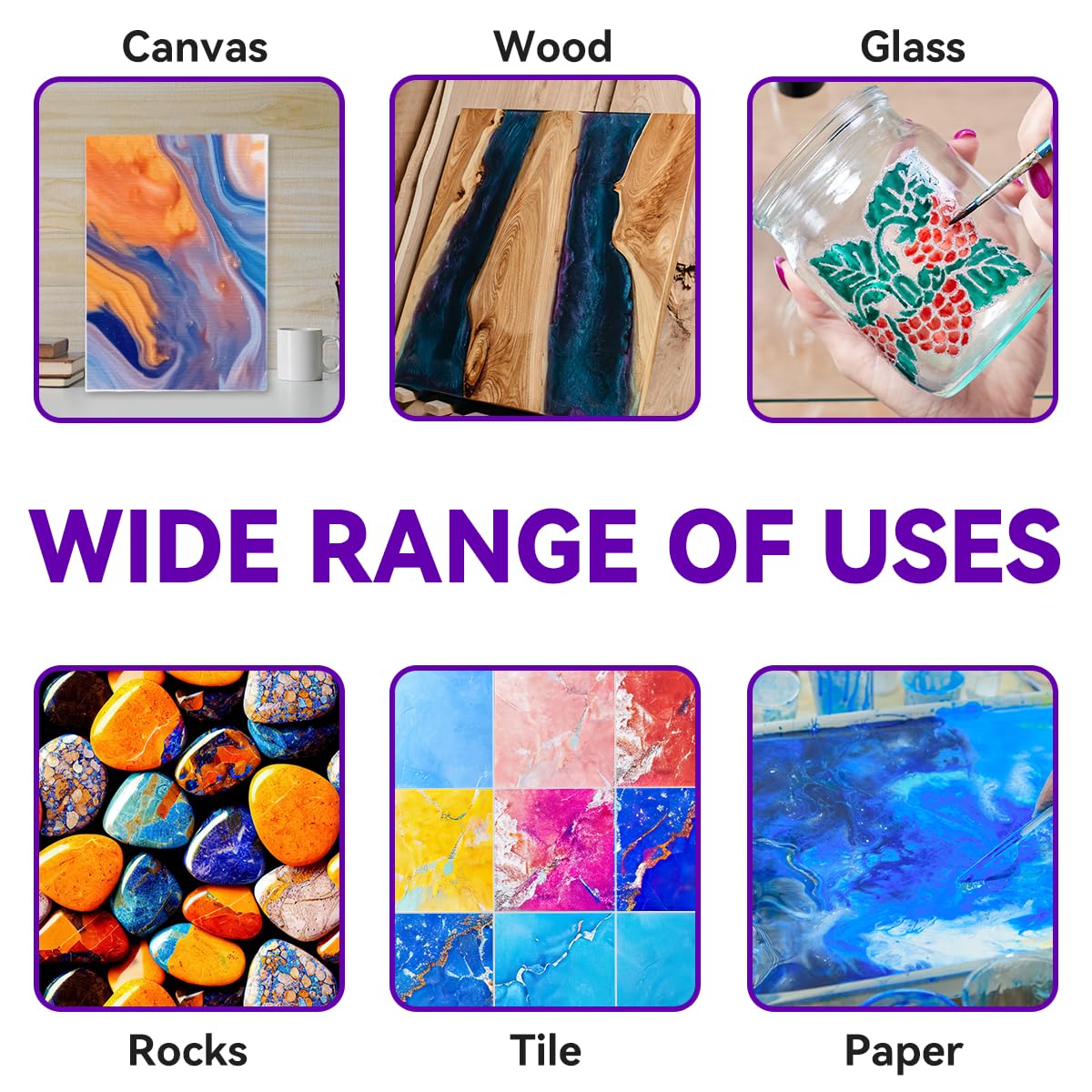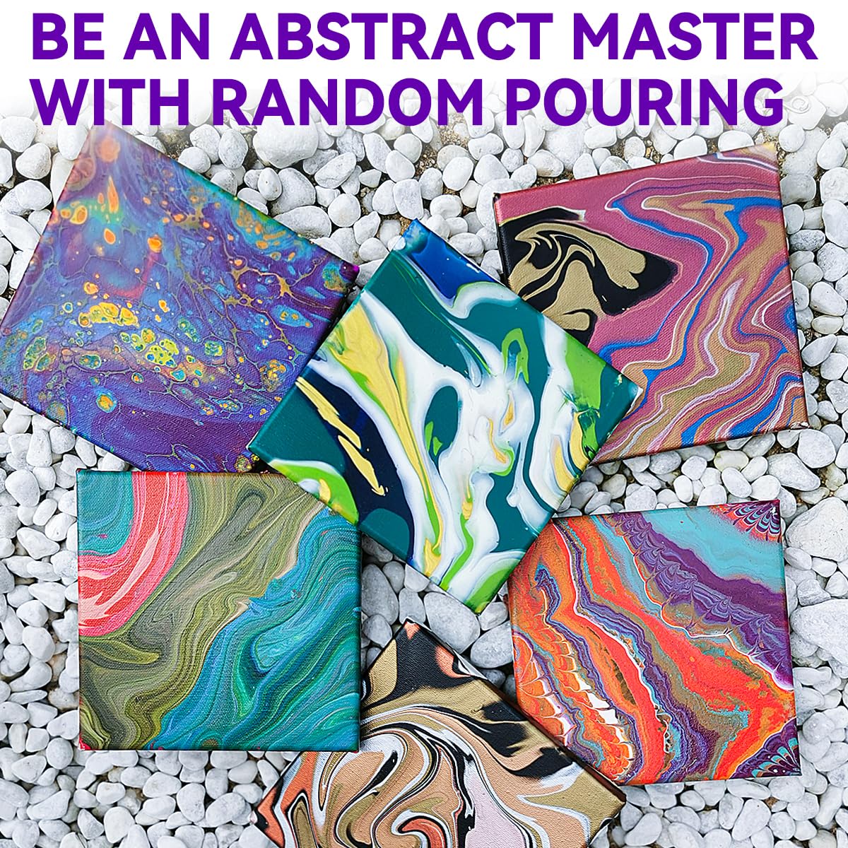 - Wide range of uses: Our acrylic paint pouring kit can be used on a variety of surfaces, such as canvas, glass, wood, ceramic, rocks, etc. Great for you be a abstract master with random pouring.