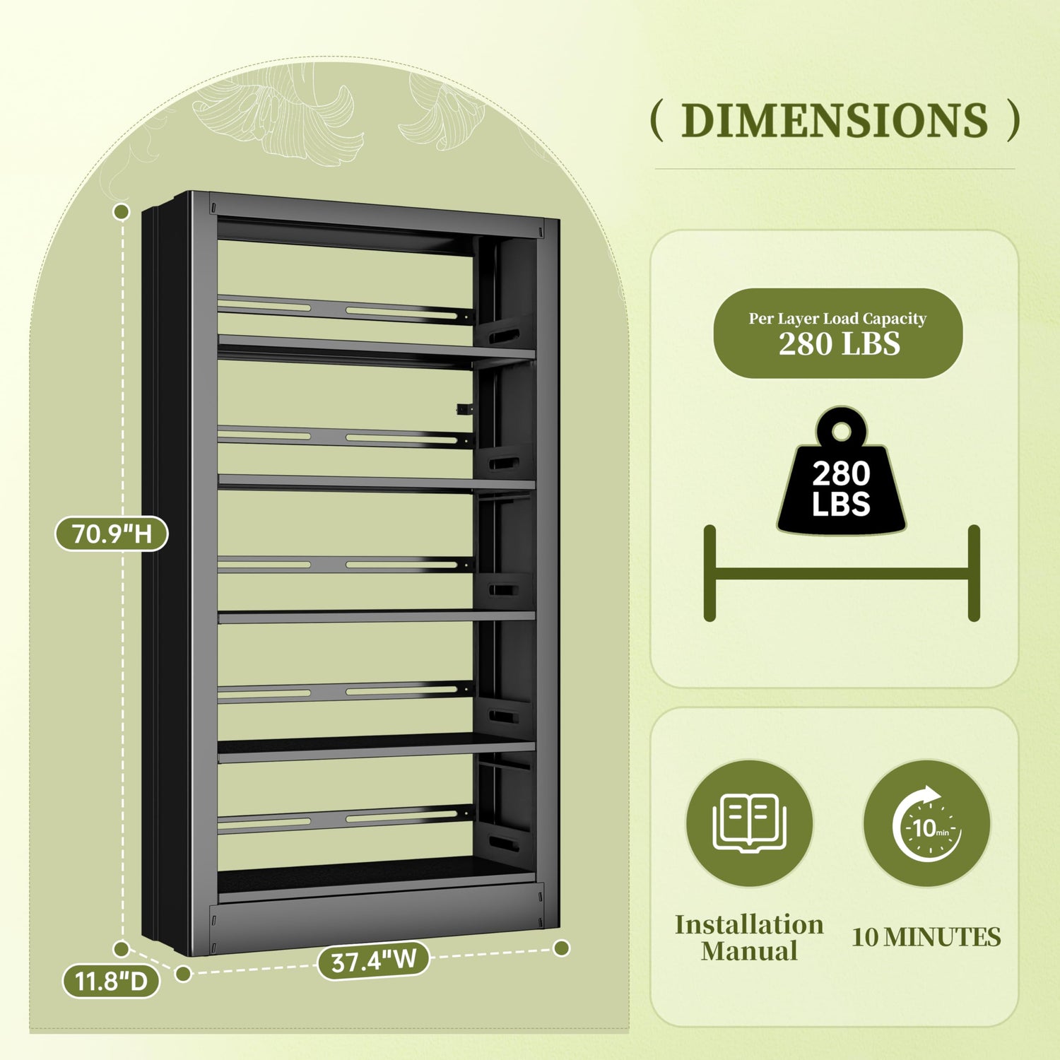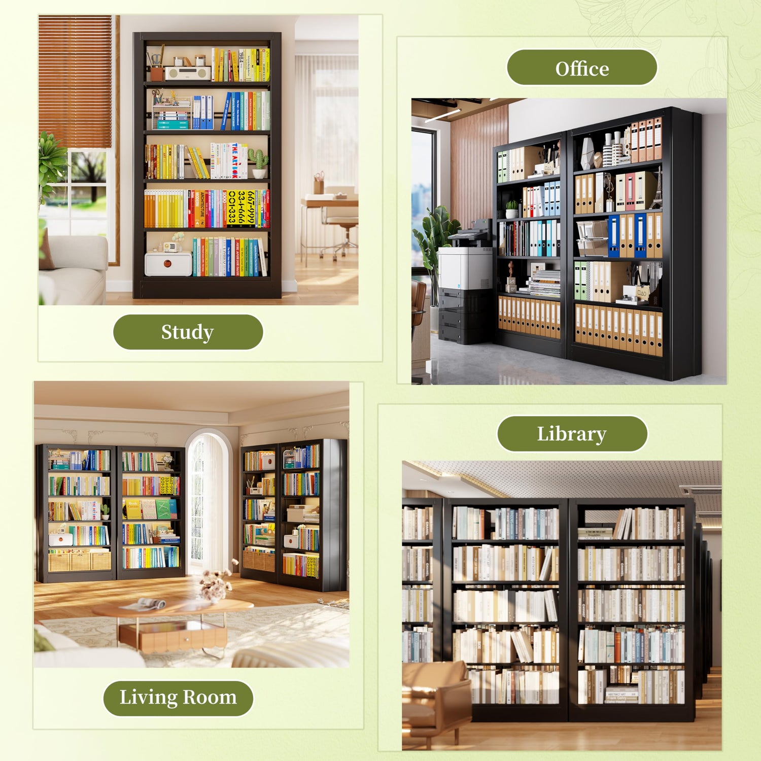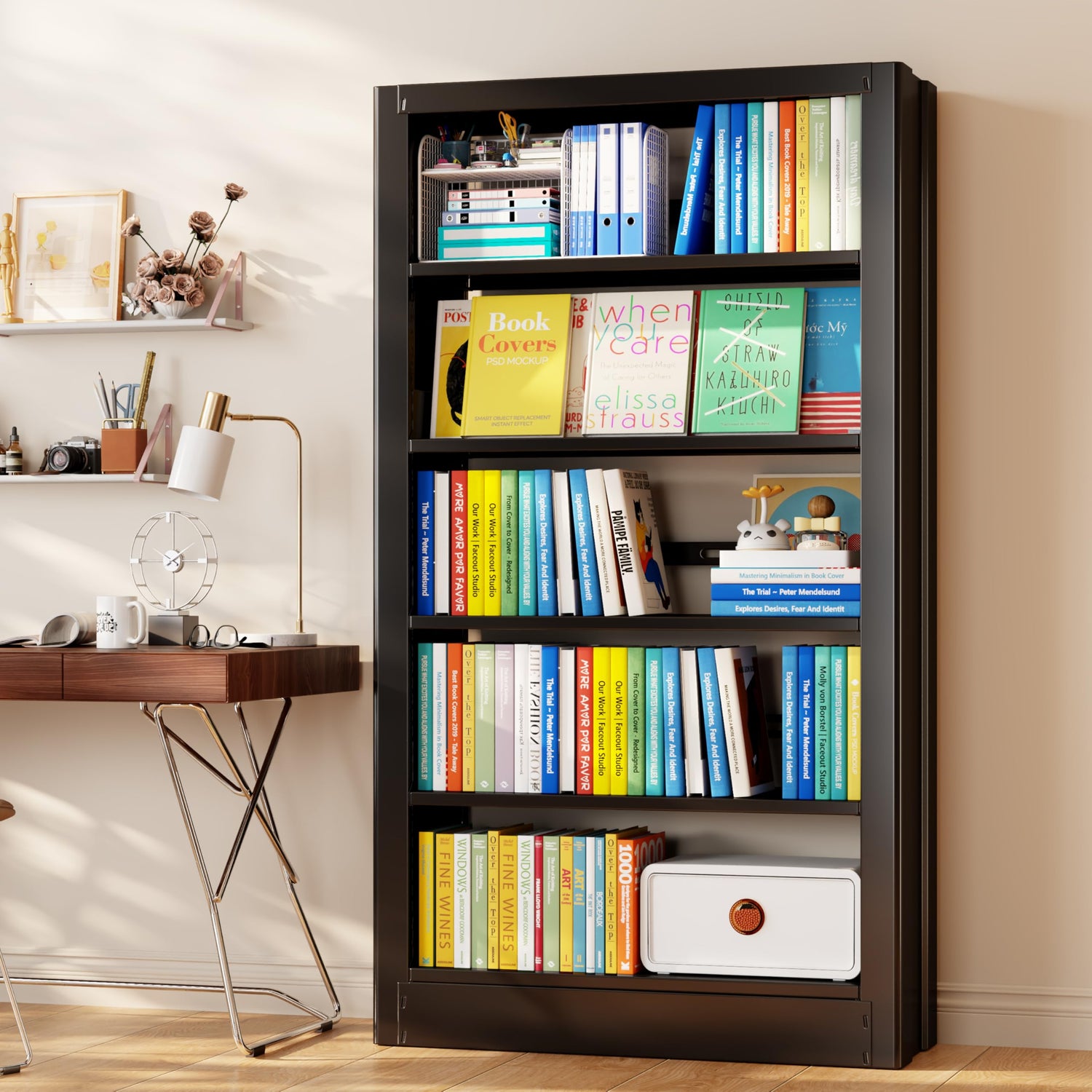 - [Spacious & Multi-Scenario Use]:With its 70.9"H tall structure and 37.4"W wide shelves, this 5-tier steel bookshelf offers ample storage space for your book collection, vinyl records, office files, decorative items, and more. Its sleek black finish complements any decor style, seamlessly blending into both home and commercial spaces—keeping your area organized while adding a clean, modern touch.Very suitable for use as library bookcase, office bookshelf, and home book cases, and more