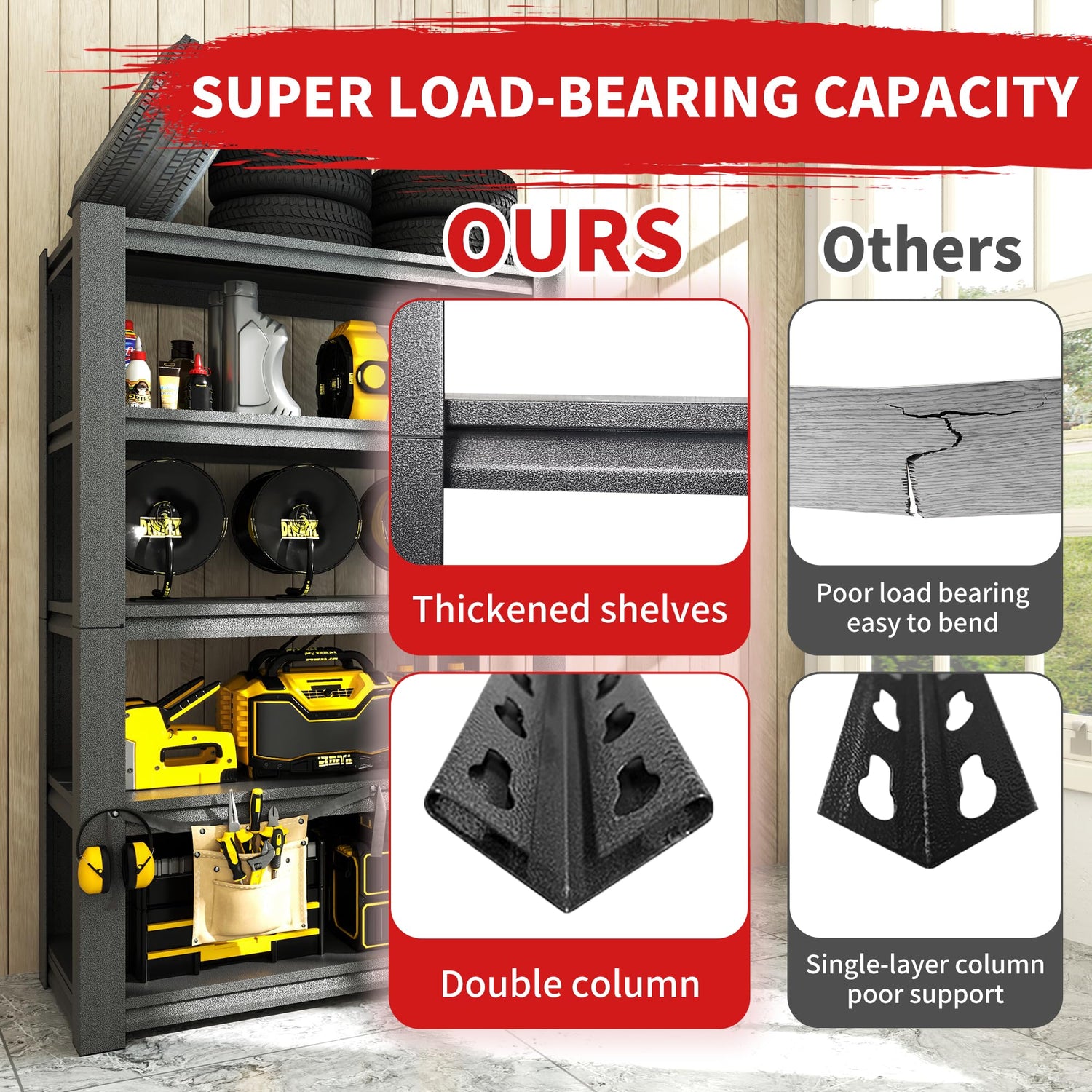 - 【METAL HEAVY DUTY GARAGE SHELVING】This steel metal shelf is made of heavy-duty steel,the metal shelves and columns are made of double-layer metal material,each sturdy thickened garage racks for storage have support beam underneath,After mounting securely,each metal shelves for storage layer can hold up to 400 lbs,so it's more stable and durable than ordinary plastic or fragile wood plank metal storage shelves won't bend due to placing heavy objects,can hold suitable for oil drums,tires,heavy duty toolboxes and other heavy objects.