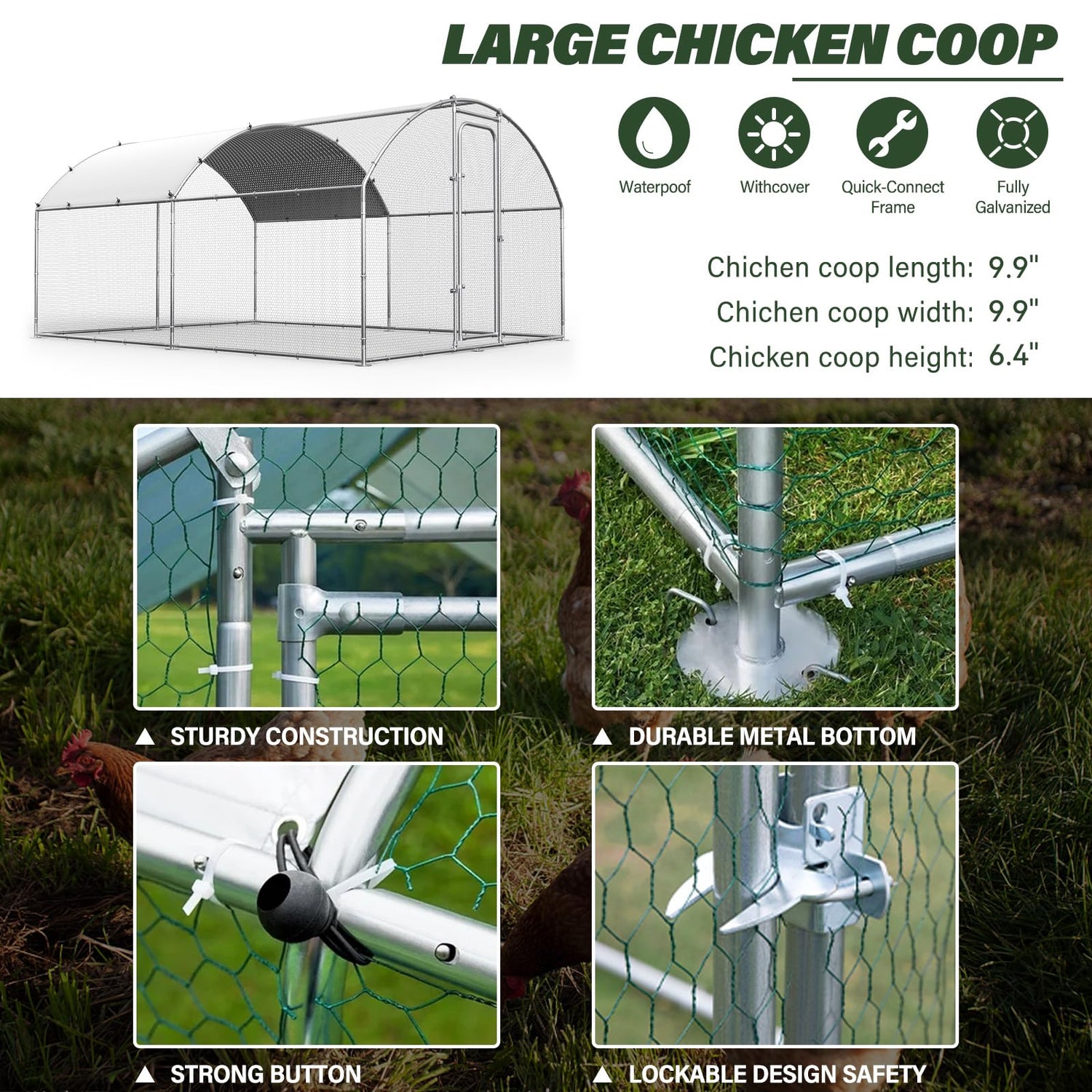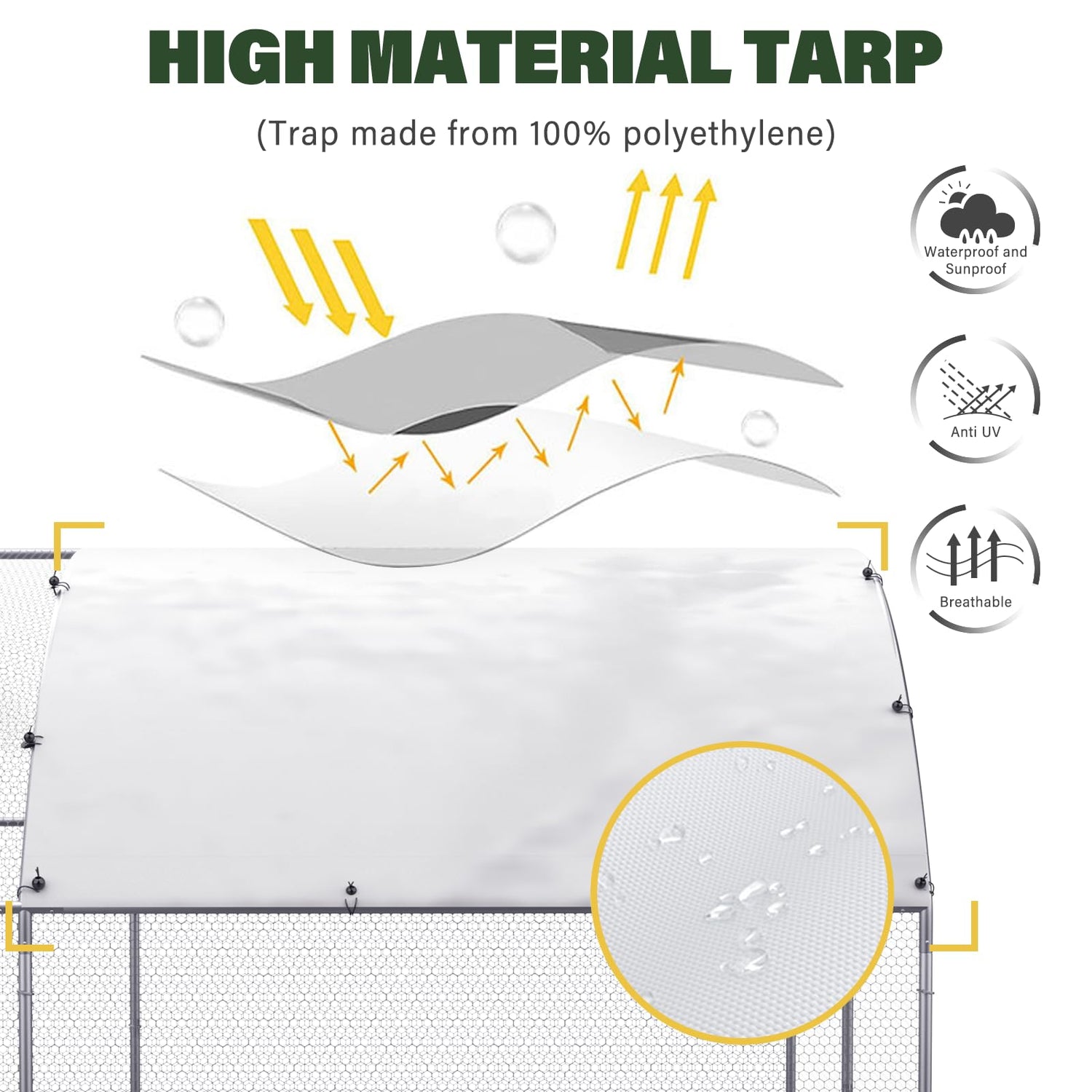 - 🐓【Waterproof and Anti-Ultraviolet Cover】- Our large walk-in metal chicken coops are covered with a durable polyethylene tarp on top for full sun, rain, and snow protection for your pets, with added UV protection to prevent tearing, cracking, fading, or peeling for years to come.