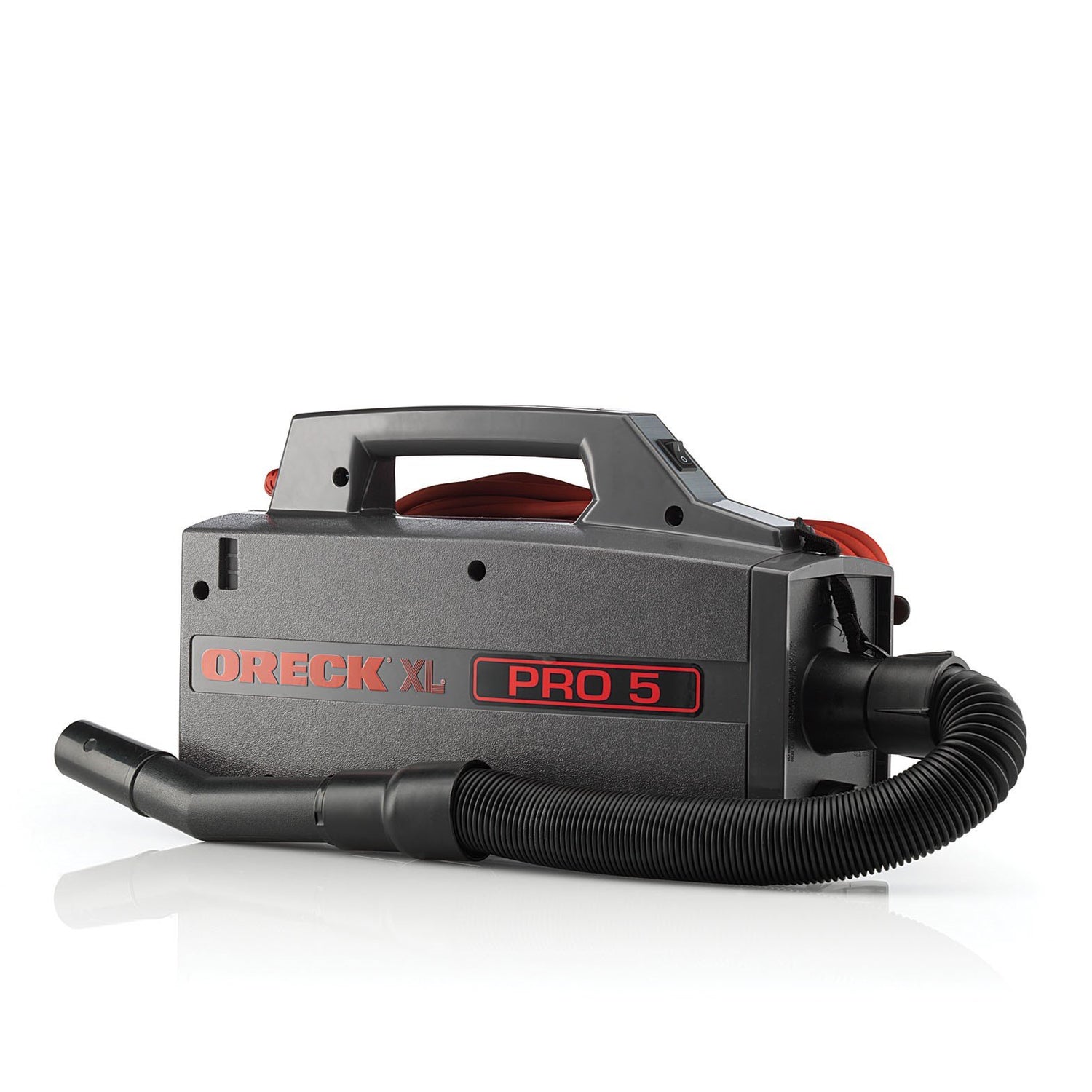 Details: The ORECK COMMERCIAL XL Pro 5 Super Compact Canister Bagged Vacuum Cleaner with Attachments is ideal for hard-to-reach spaces, stairs, furniture, ceiling fans, molding, bookshelves, curtains, drapes, light fixtures, and more. Designed for effortless use, this handheld features a 30 long foot power cord with a Quick-Dump Cord wrap. The compact, lightweight design can be carried by hand or shoulder. This compact canister has the power of heavier canister, with a powerful high vortex motor providing strong suction and long life. With included accessories, this canister vacuum is one of the most versatile compact vacuum cleaners available.