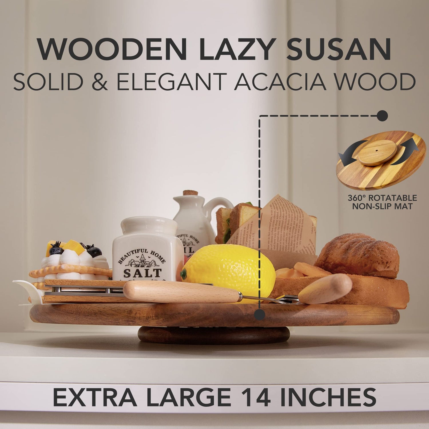 - Organized and Tidy Kitchen: This acacia wood lazy susan organizer measures 12/14" diameter x 1.18" height. Featuring a smooth 360 degree rotating design, this spice organizer can store and organize baking supplies, condiments, sauce and spice jars on the kitchen countertop, to keep kitchen gadgets accessible and orderly, so you can quickly find what you need when cooking. This turntable organizer also can display decorations on your dining table for gatherings with family and friends.