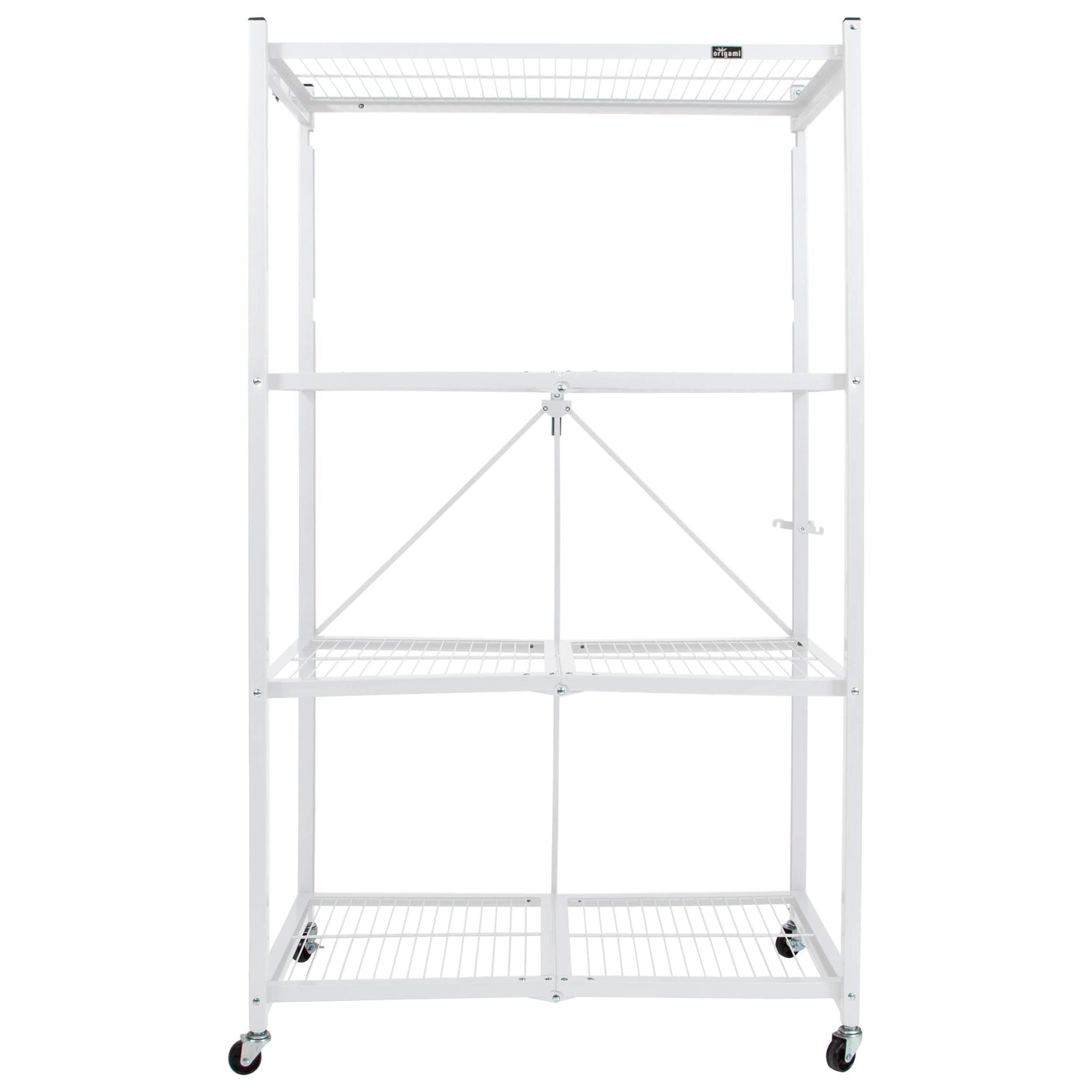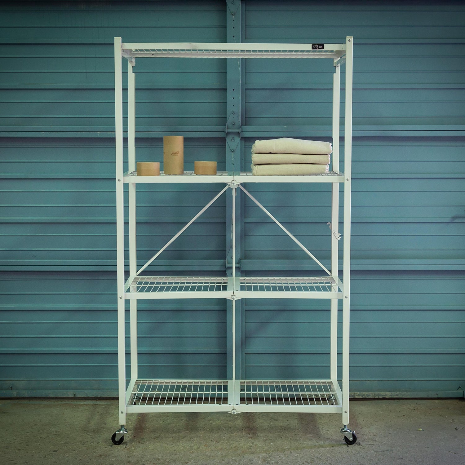 Details: This versatile and robust multipurpose storage unit from Origami is a must-have organizational solution for every modern home. With its sleek finish, the R5 Folding 3-Tiered Shelf Storage Rack on Wheels seamlessly blends into any living space and offers an efficient and convenient way to declutter your surroundings. Designed with spacious shelves and made from commercial-grade powder-coated steel, this 4-tiered organization and storage rack ensures optimal storage for your belongings. For added convenience and mobility, the shelving unit includes 4 caster wheels. Without wheels on the rack, this shelf organizer can hold up to 750 pounds (250 pounds per shelf), while it can hold up to 225 pounds (75 pounds per shelf) with wheels. Boasting both durability and optimal functionality, this foldable garage shelving has multiple tiers to accommodate a wide range of household items. This shelving unit is built for convenience and reliable storage, suitable for garages, warehouses, offices, basements, classrooms, and more. Use it for bathroom storage, laundry room organization, as a closet organizer cart, open pantry and kitchen storage, or as a bookshelf in the living room. Best of all, this rolling cart requires no tools or lengthy assembly time. To set up, unfold the wire shelving frame, flip the top shelf down, and secure the patented Origami connection clip. You're ready to store bins and boxes in just about 20 seconds! Simply fold the storage cart flat when not in use. When it's time to tidy up, declutter, or you want to add a display shelf for home decor, Origami has the versatility you need. Take on any storage and organization task with confidence using the R5 Foldable 4-Tier Storage Rack on Wheels.