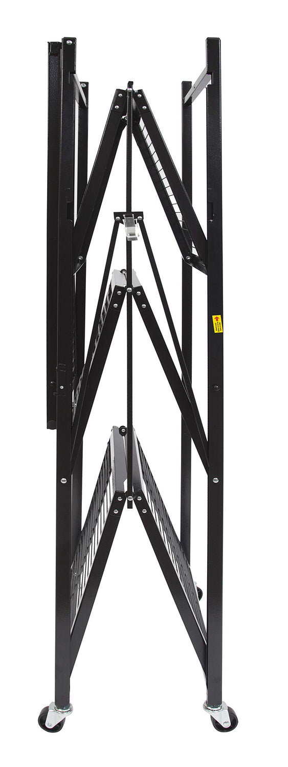 Details: Origami 4-Shelf R5 Series Say hello to our newest heavy duty multi-functional storage rack. Say good-bye to the days of "wobbly" racks. This one is rock solid and can hold up to 1000 lbs of your stuff. Not only is it functional but super easy to set-up. Unfold and latch and its ready to use in 20 seconds. No tools or assembly required! Organizing doesnt get any easier than this! Great for all your storage needs in your home, office, warehouse and garage. Product Specs Overall Dimensions: 36" W x 21" D x 61.75" H Folded Dimensions: 3.5" W x 21" D x 61.75" H Product Weight: 41 lbs Weight capacity per shelf: Approx. 250 lbs. (without wheels); Approx. 75 lbs. (wheels attached) Distance between shelves: Approx. 17.5" H, 17.5" H, 19" H (Bottom to Top) *All dimensions have been rounded to the nearest 1/4 inch. Please allow some margin of discrepancy. Included Items (2) R5 Series Origami 4-Shelf Large Storage Rack (4) Professional Grade Caster Wheels 1-year Limited Origami Warranty
