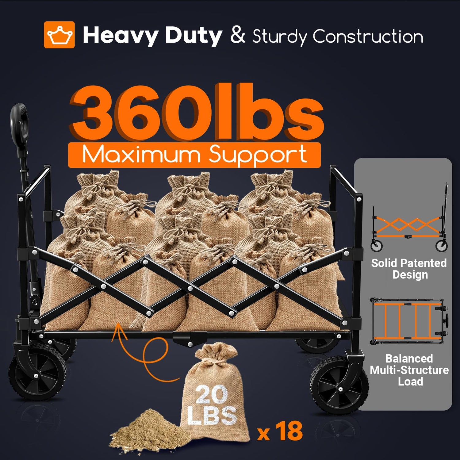- ใ๐ฆ๐๐๐ฟ๐ฑ๐ ๐๐ฒ๐ฎ๐๐ ๐๐๐๐ ๐๐ผ๐น๐ฑ๐ฎ๐ฏ๐น๐ฒ ๐๐ฎ๐ฟ๐ ๐๐ถ๐๐ต 360๐๐๐ฆ ๐๐ผ๐ฎ๐ฑ ๐๐ฎ๐ฝ๐ฎ๐ฐ๐ถ๐๐ใThis folding wagon is made of sturdy, high-quality alloy steel, 20% thicker than other folding wagons. Featuring innovative structural design, static load capacity up to 360lbs and dynamic load capacity up to 220lbs, it is ideal for groceries transporting, shopping, gardening, camping, outdoor sports, travel.