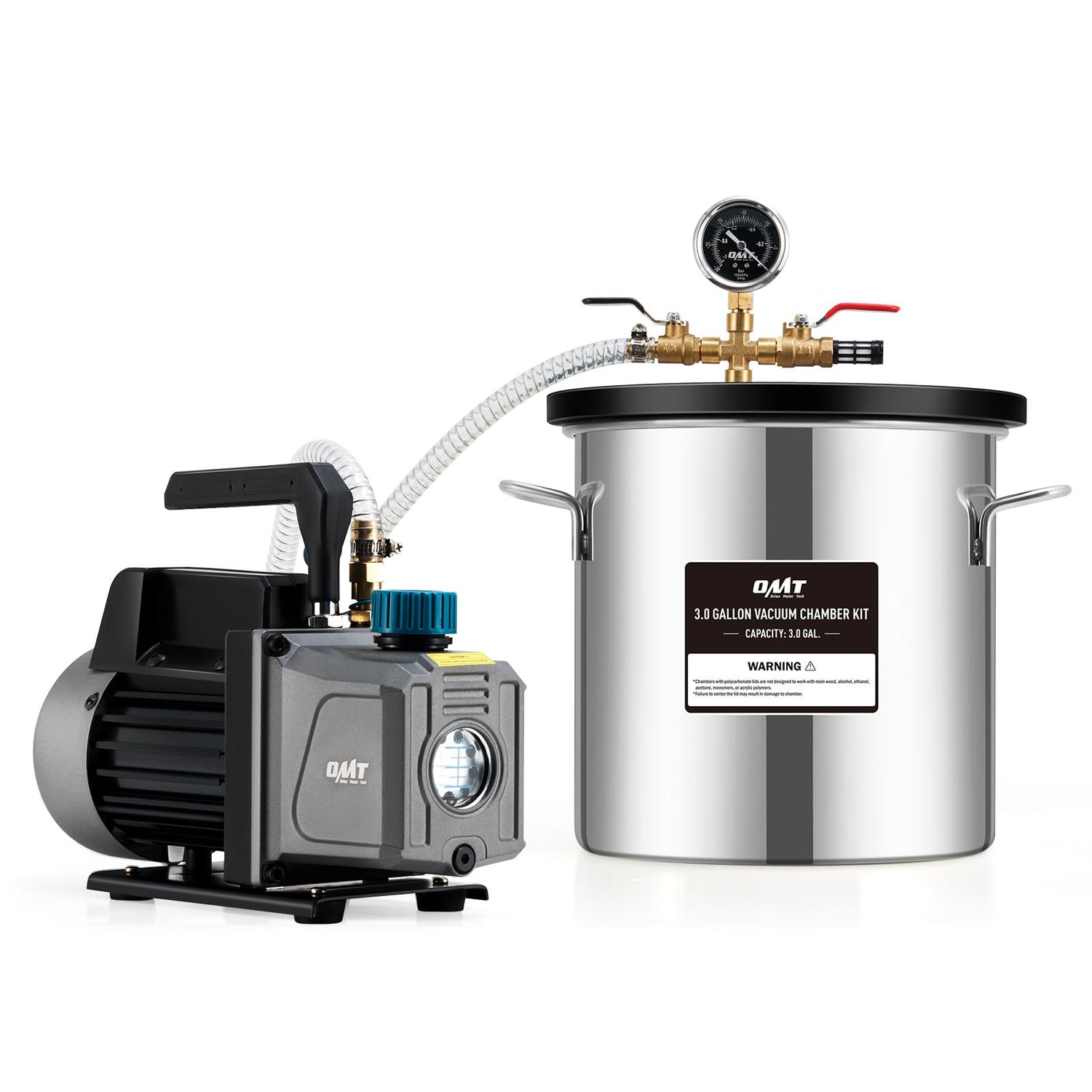 Orion Motor Tech 3 Gal Vacuum Chamber with Pump Kit, 3.5 cfm Vacuum Pump and Chamber Kit with Tempered Glass Lid 5 ft Hose, Vacuum Degassing Chamber Kit for Stabilizing Wood Degassing Silicone Resin