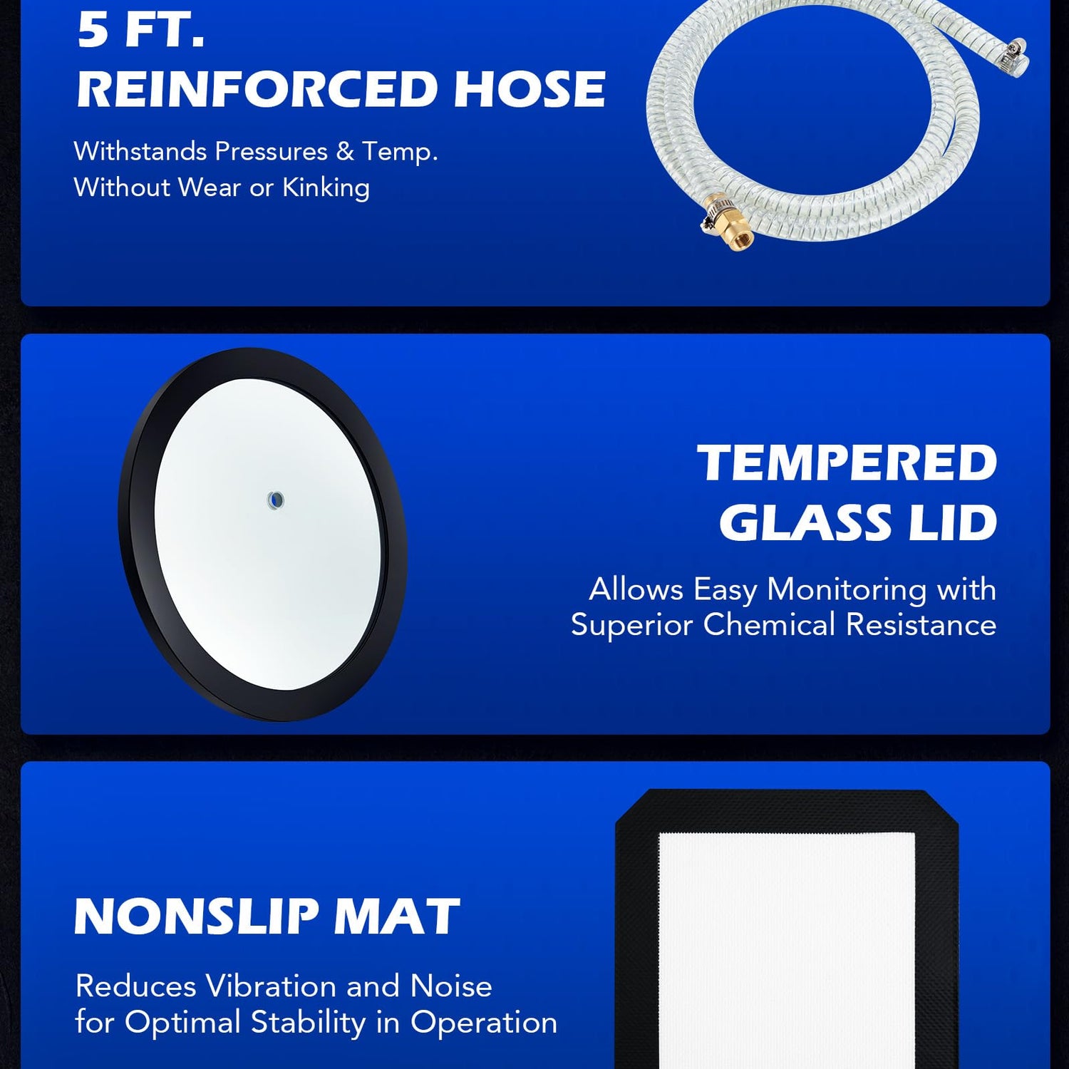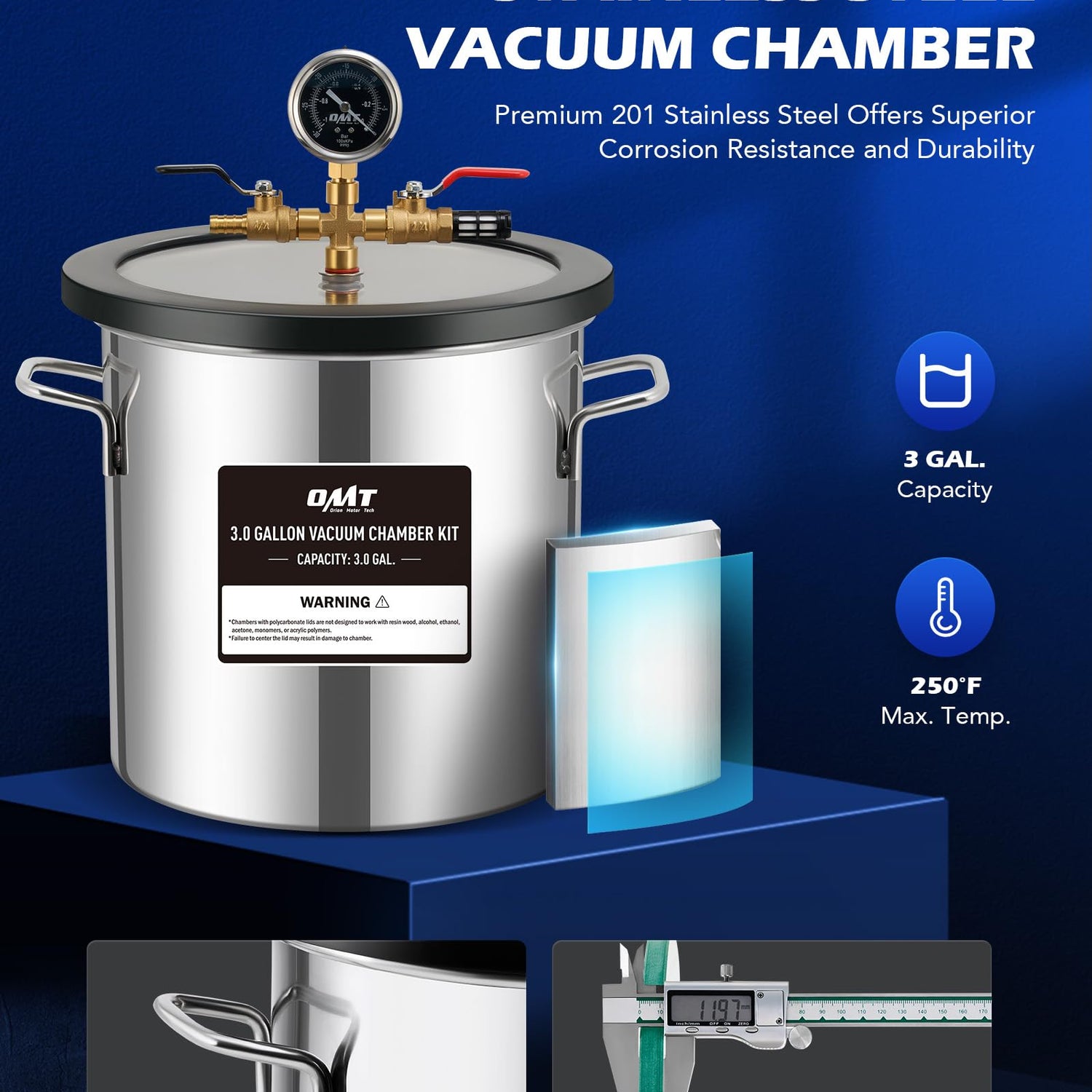 - 3 Gallon Stainless Steel Chamber: Made of brushed 201 stainless steel, this vacuum chamber withstands pressure, corrosion, and heat up to 250°F. The transparent tempered glass lid and liquid-filled gauge allow easy monitoring of the degassing process, while two air filter and a nonslip pad help minimize noise.