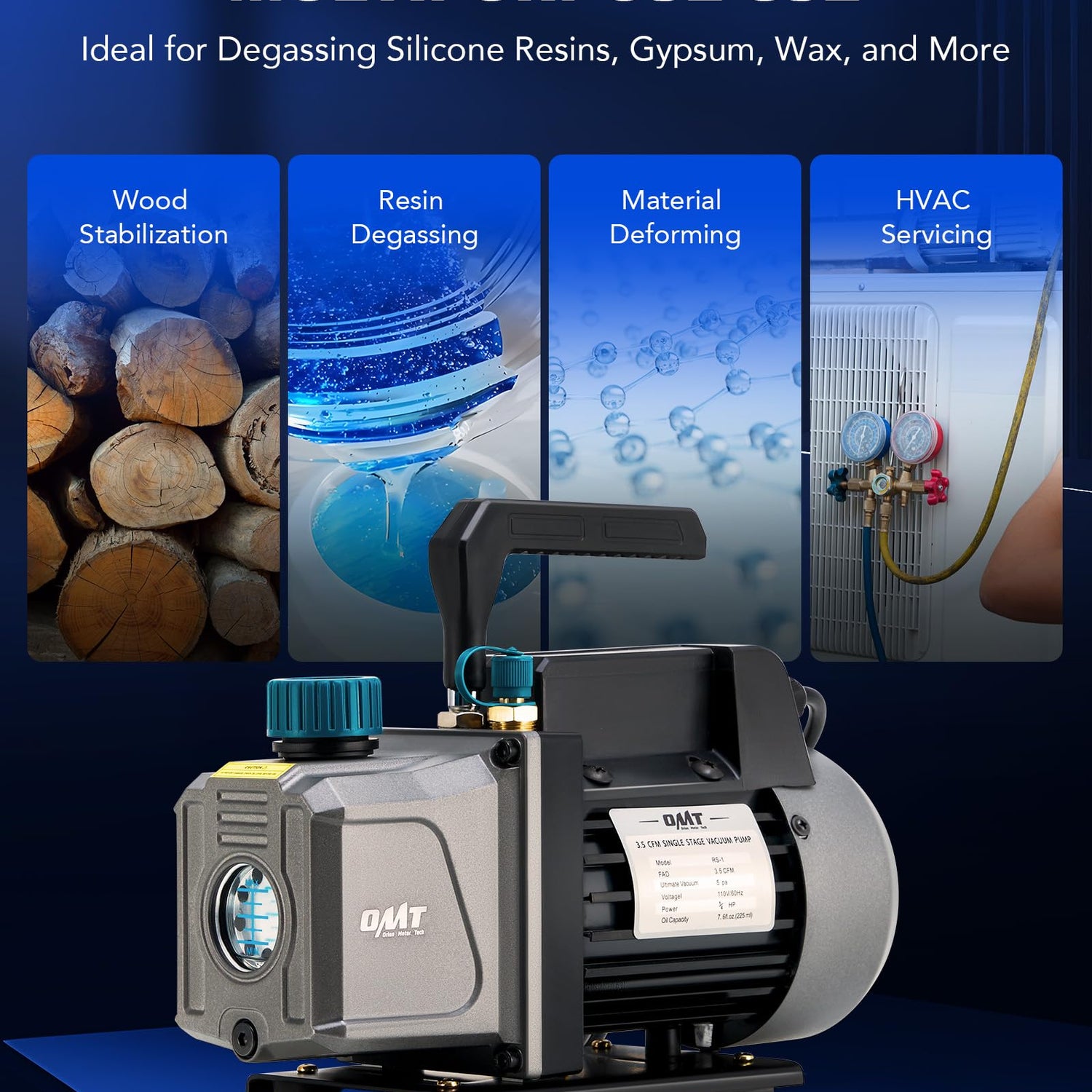Keep your degassing fast, easy, and safe with this vacuum pump and chamber kit by Orion Motor Tech! Our professional vacuum chamber kit includes a 1/4 hp vacuum pump, a 3 gallon vacuum chamber, a reinforced wire hose, and all the accessories needed for quick and secure wood stabilization, silicone degassing, and more. The 186W all copper motor offers a 3.5 cfm flow rate, creating vacuums as thin as 37.5 microns. The stainless steel vacuum chamber with a tempered glass lid handles up to 250°F, ensuring superior durability and chemical resistance for wood stabilization tasks. Monitor your degassing process effortlessly through the liquid-filled gauge, while minimizing noise with two air filters and a nonslip pad. The provided ports and adapter also allow this pump to be used with 1/4, 3/8, and 1/2 inch HVAC hoses, enabling a wide range of services.