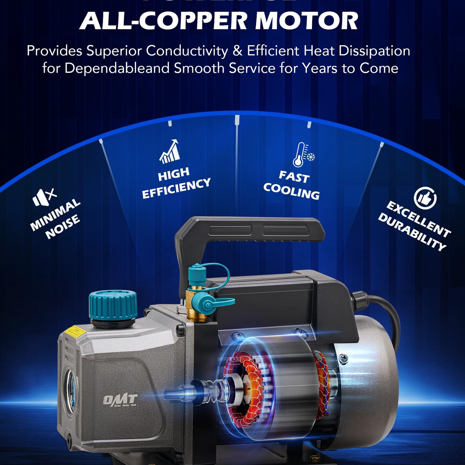 - High Efficiency Vacuum Pump: Equipped with a robust all-copper motor, this vacuum pump ensures efficient evacuation at a 3.5 cfm flow rate. Its reinforced aluminum alloy casing efficiently dissipates heat and resists corrosion, and brass-fitted tethered safety caps prevent oil leaks during transport.