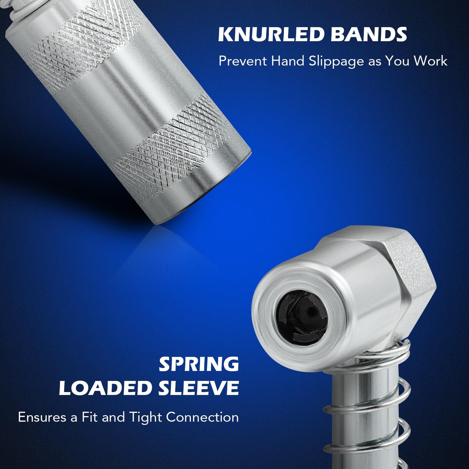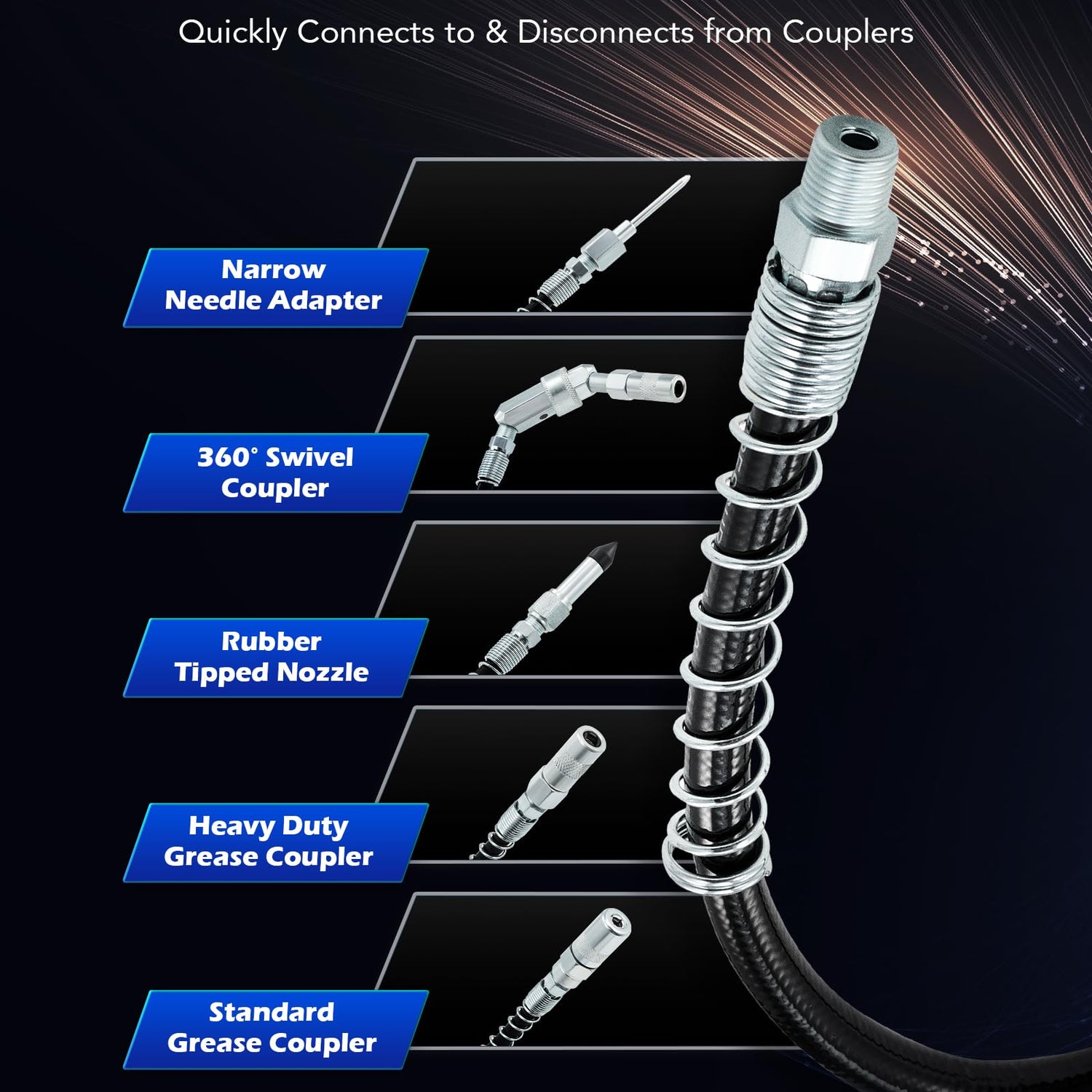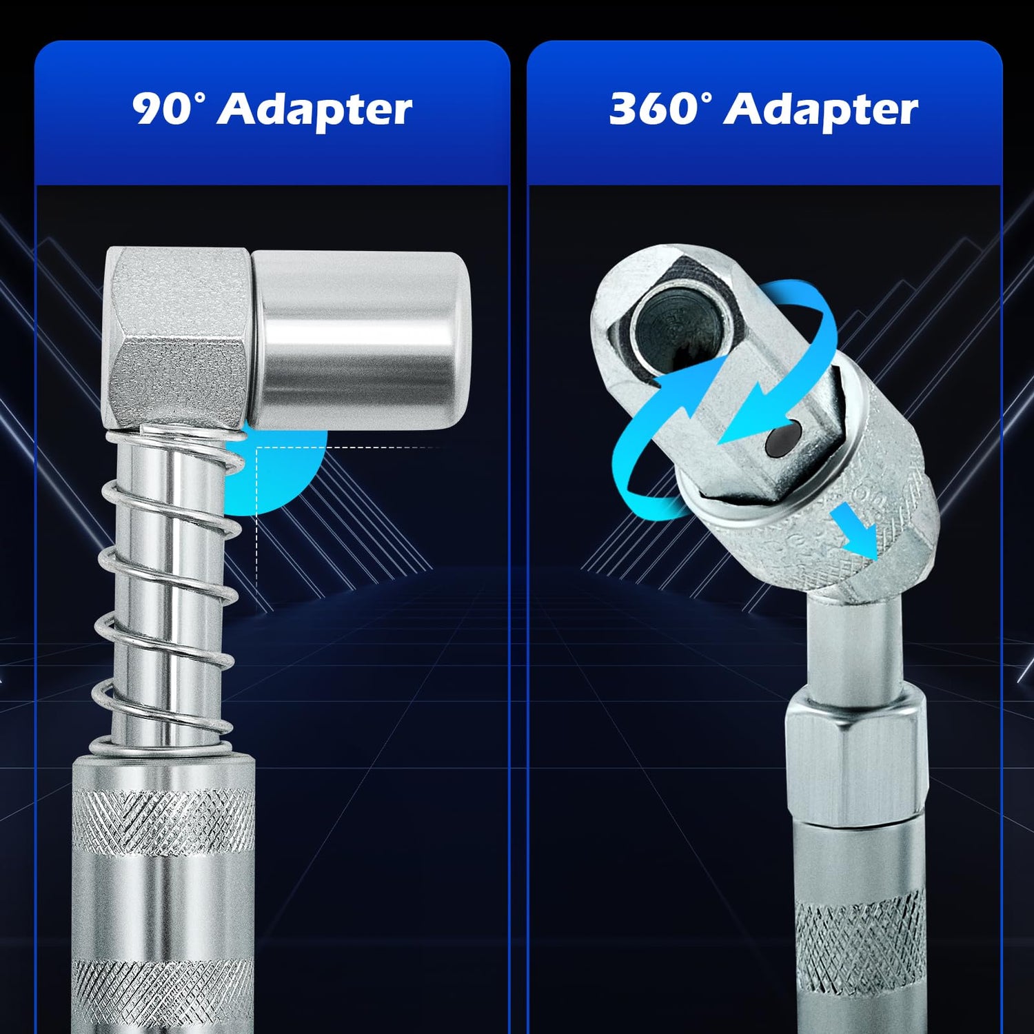 - User-Friendly Design: The 90° grease gun adapter provides flexibility in tight spaces while the 360° swivel one covers greasing applications at all angles; the 30 cm flex grease hose with a coil spring ensures easy connections and disconnections