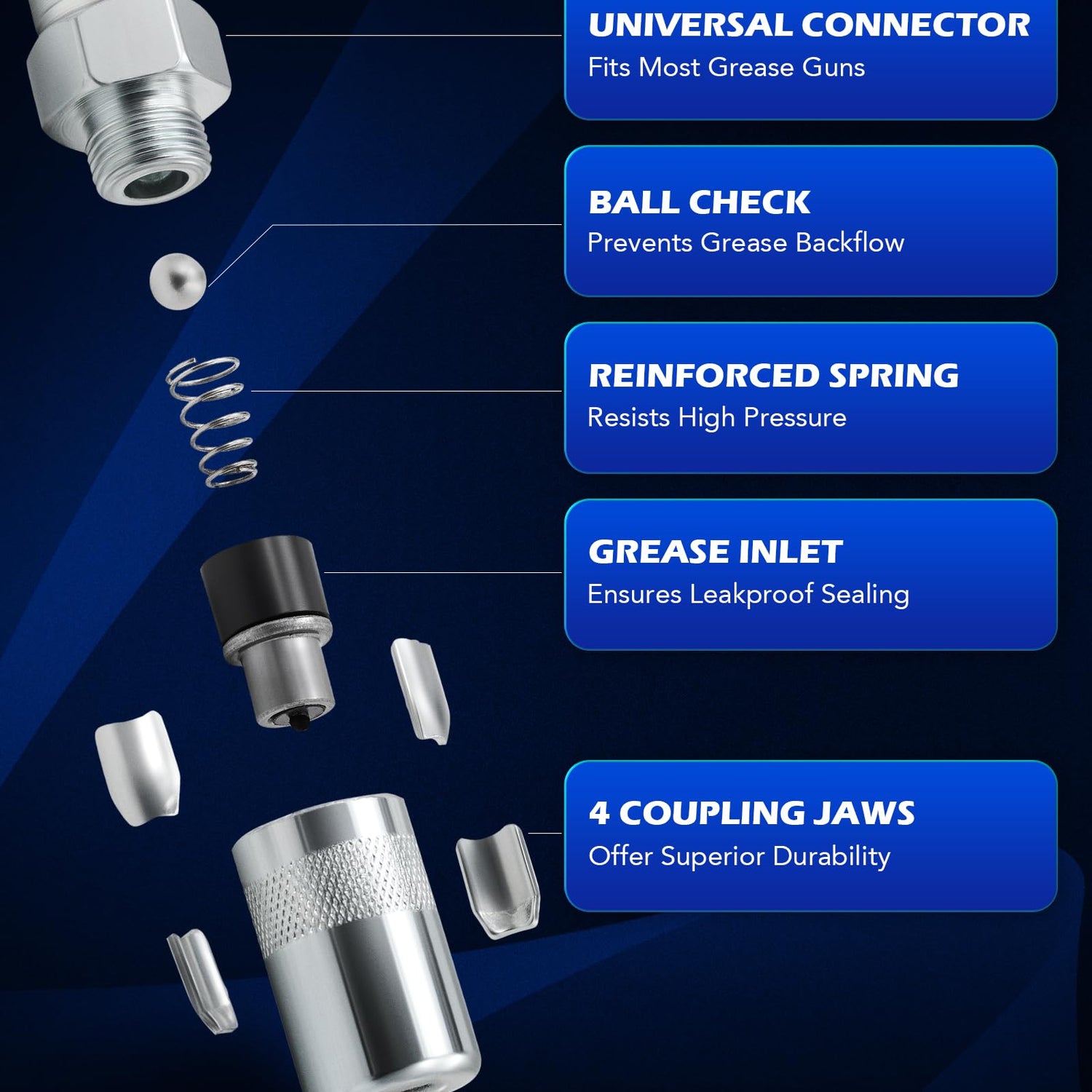 - STURDY & DURABLE: Each of our heavy-duty grease gun tip is made of quality carbon steel with a corrosion proof zinc coating to offer superior strength and unrivaled endurance