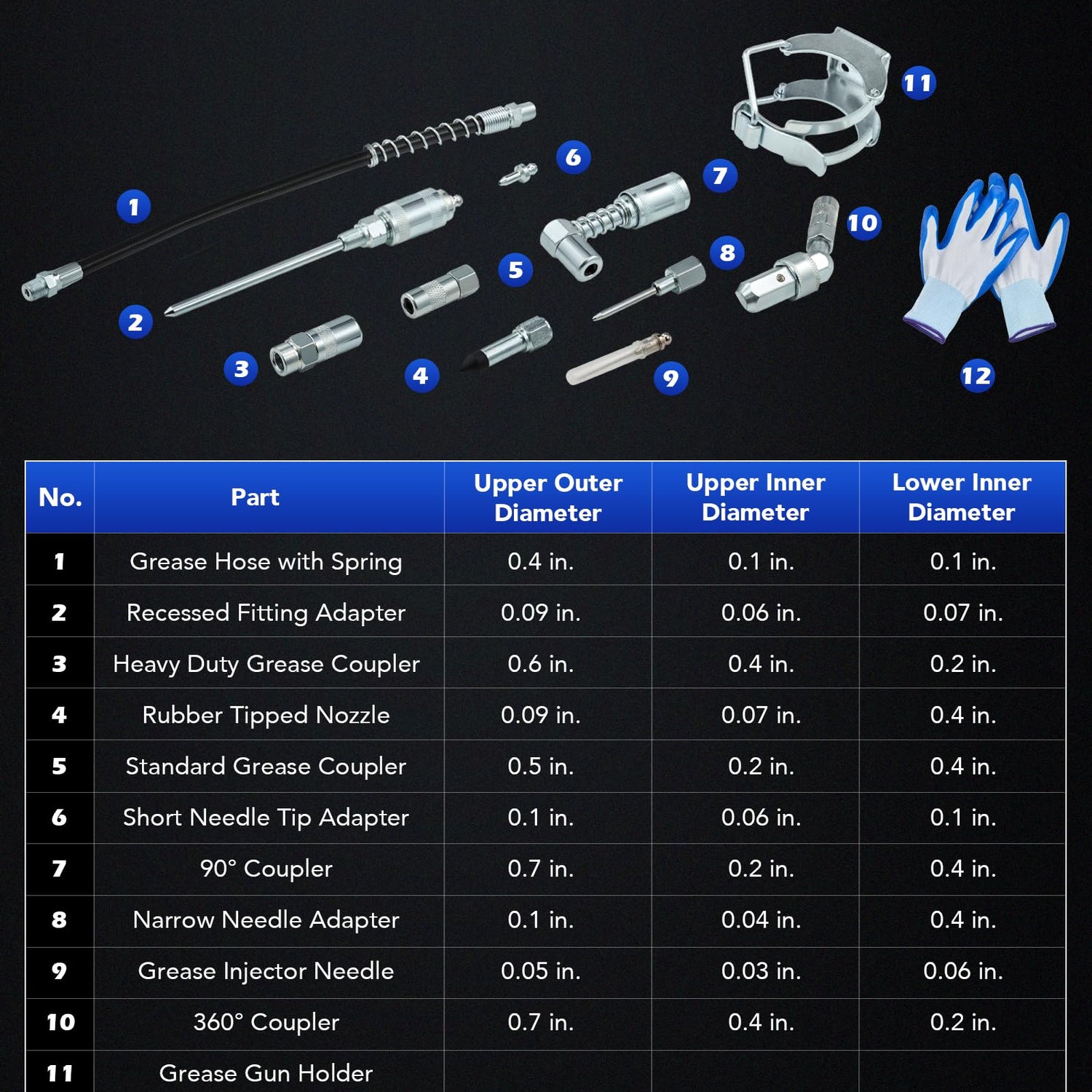 - Versatile Use: This grease gun accessory kit is compatible with most standard grease guns and grease fittings, ideal for home garages and automotive repair shops