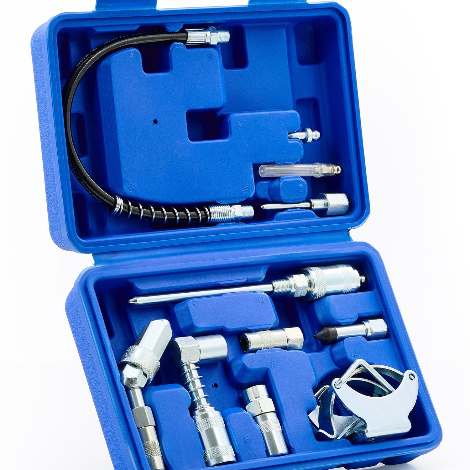 - All-In-One Set: Orion Motor Tech's 11-piece grease gun coupler kit includes an extra long grease gun hose, 9 of the most common grease gun adapters, and a grease gun holder to let you reach any fitting without elbow grease