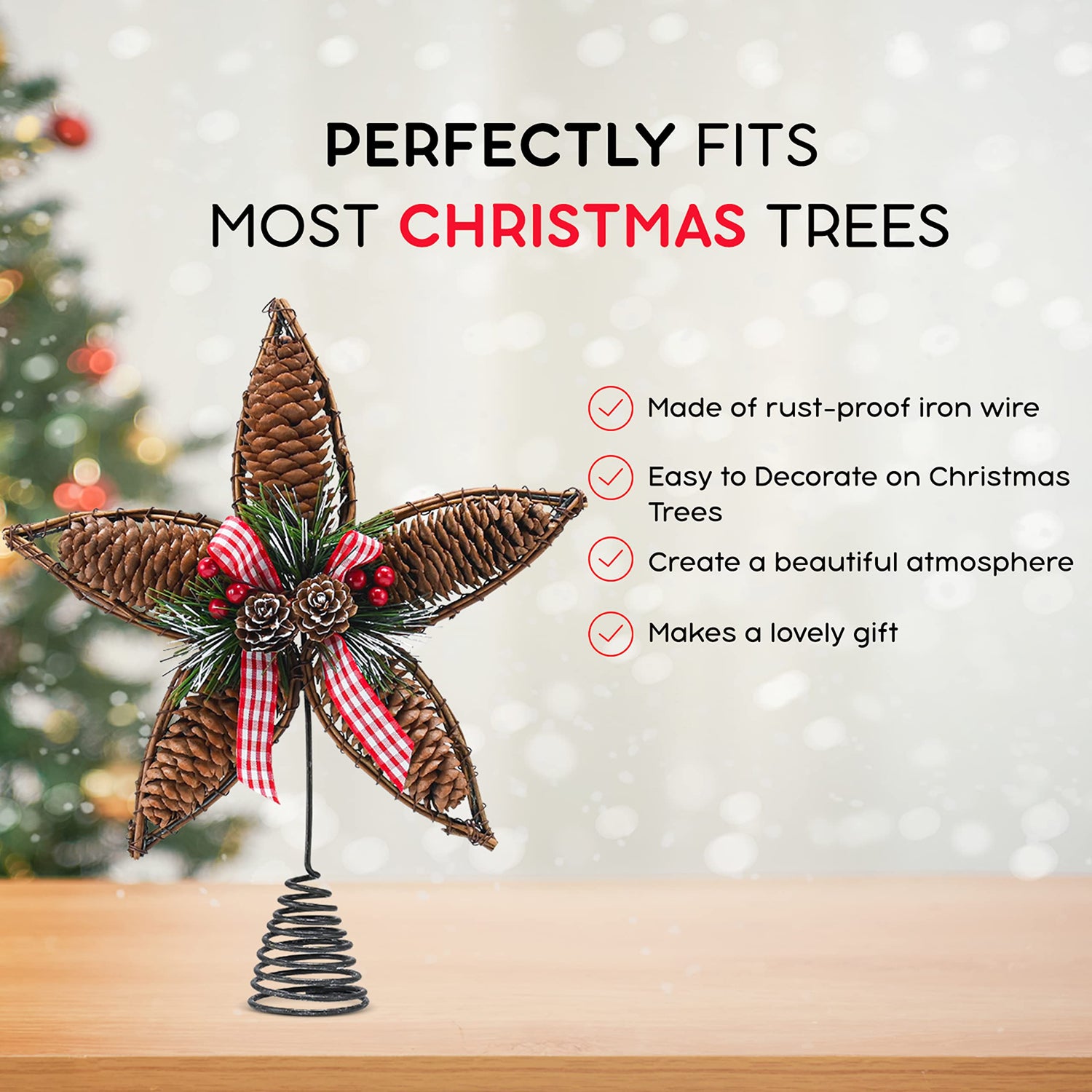 Ornativity Rattan Star Tree Topper - Christmas Rustic Acorn Pine Cone Tree Topper with Holly and Berry Decor Holiday Xmas Trees Top Decorations 11.5"