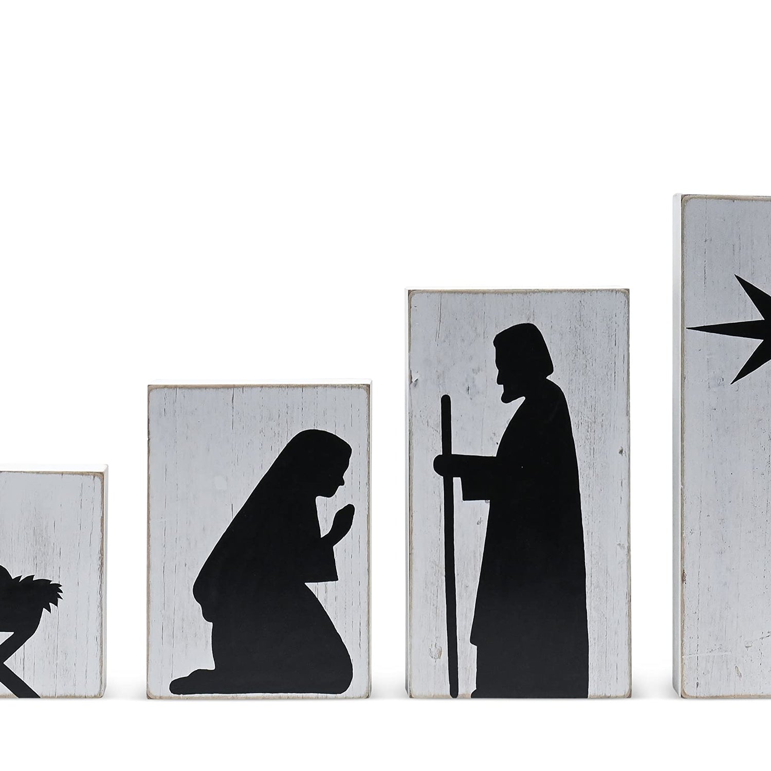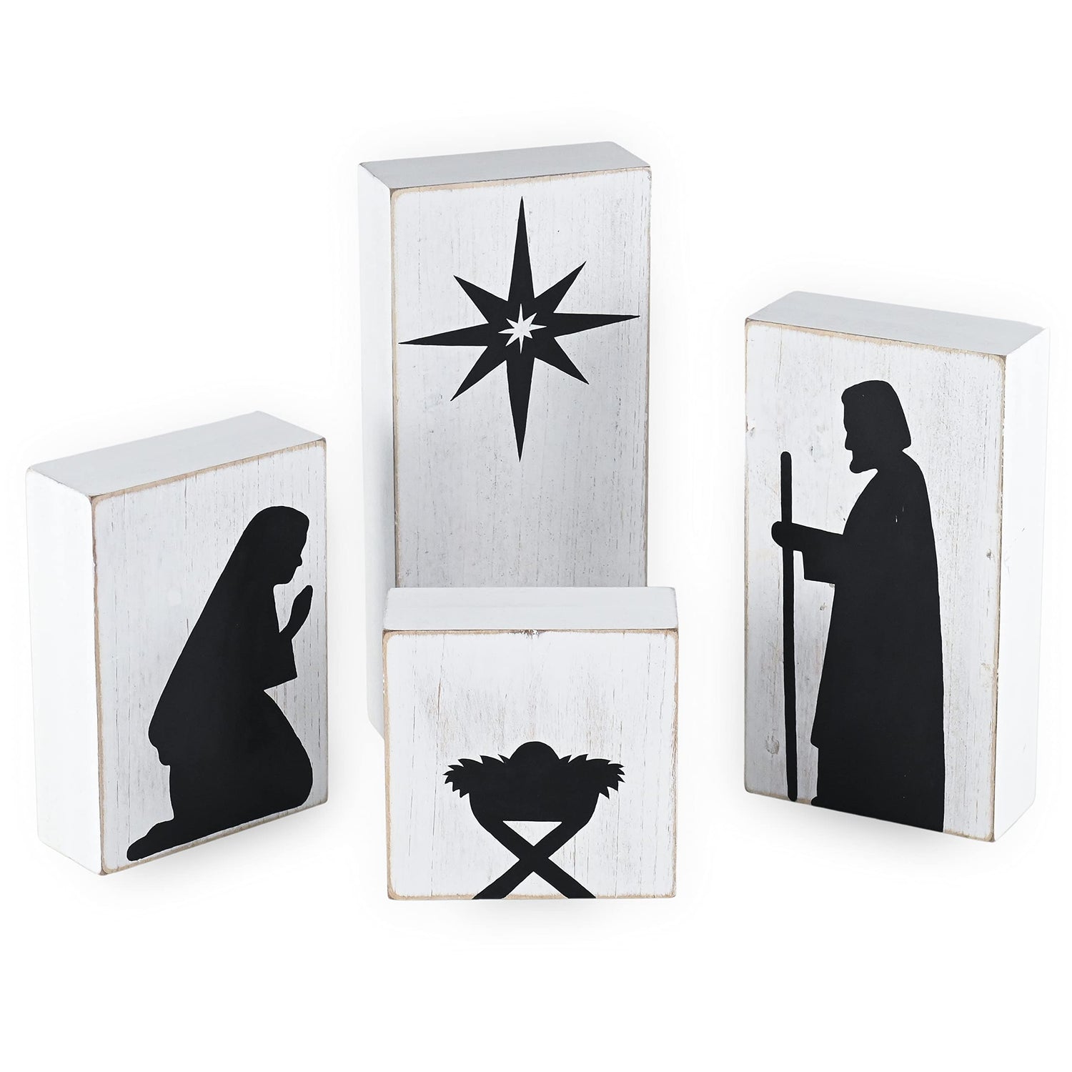 Ornativity Wooden Block Nativity Scene - Black Xmas Silhouette Christmas Figures on White Painted Wood Blocks Indoor Nativity Table Top Shelf Sitter Mantle Centerpiece Set Decorations - 1 set