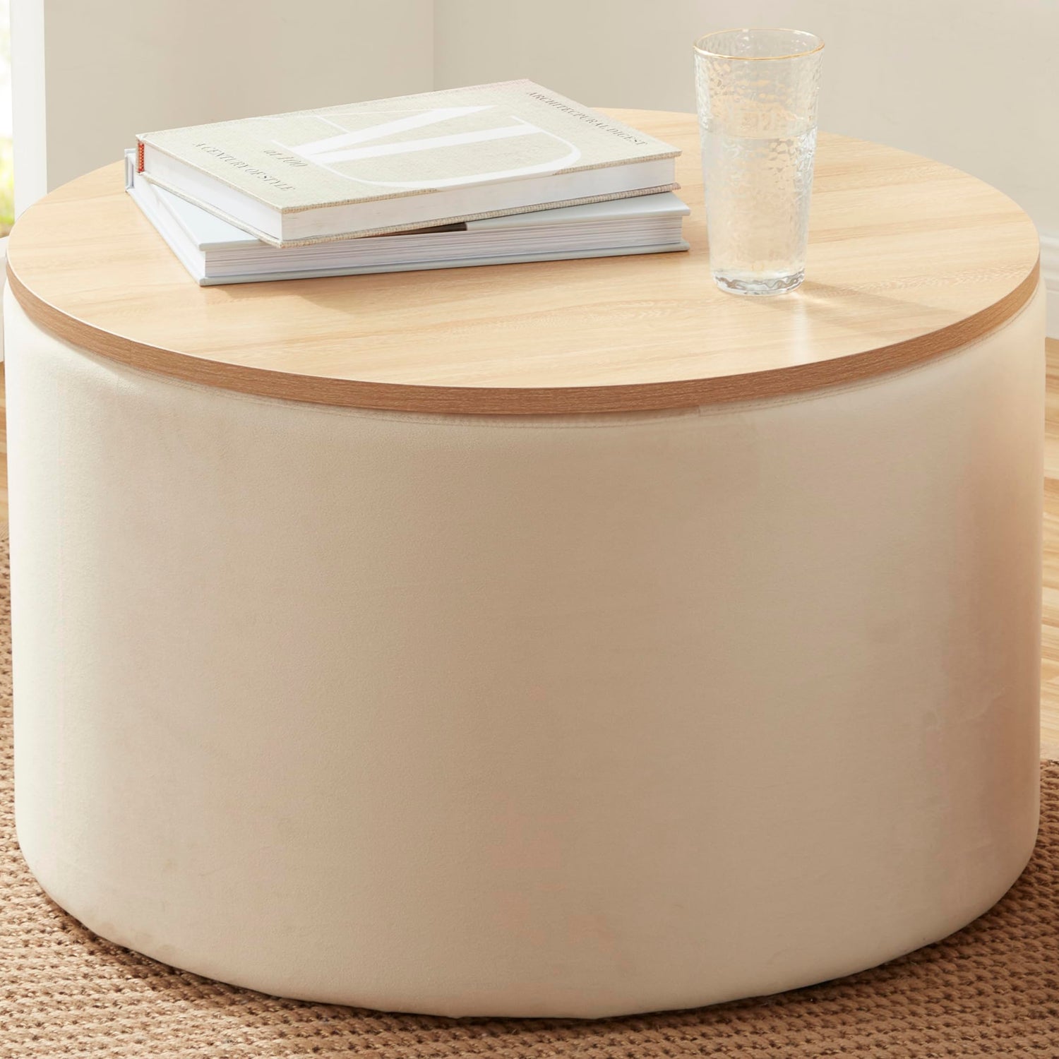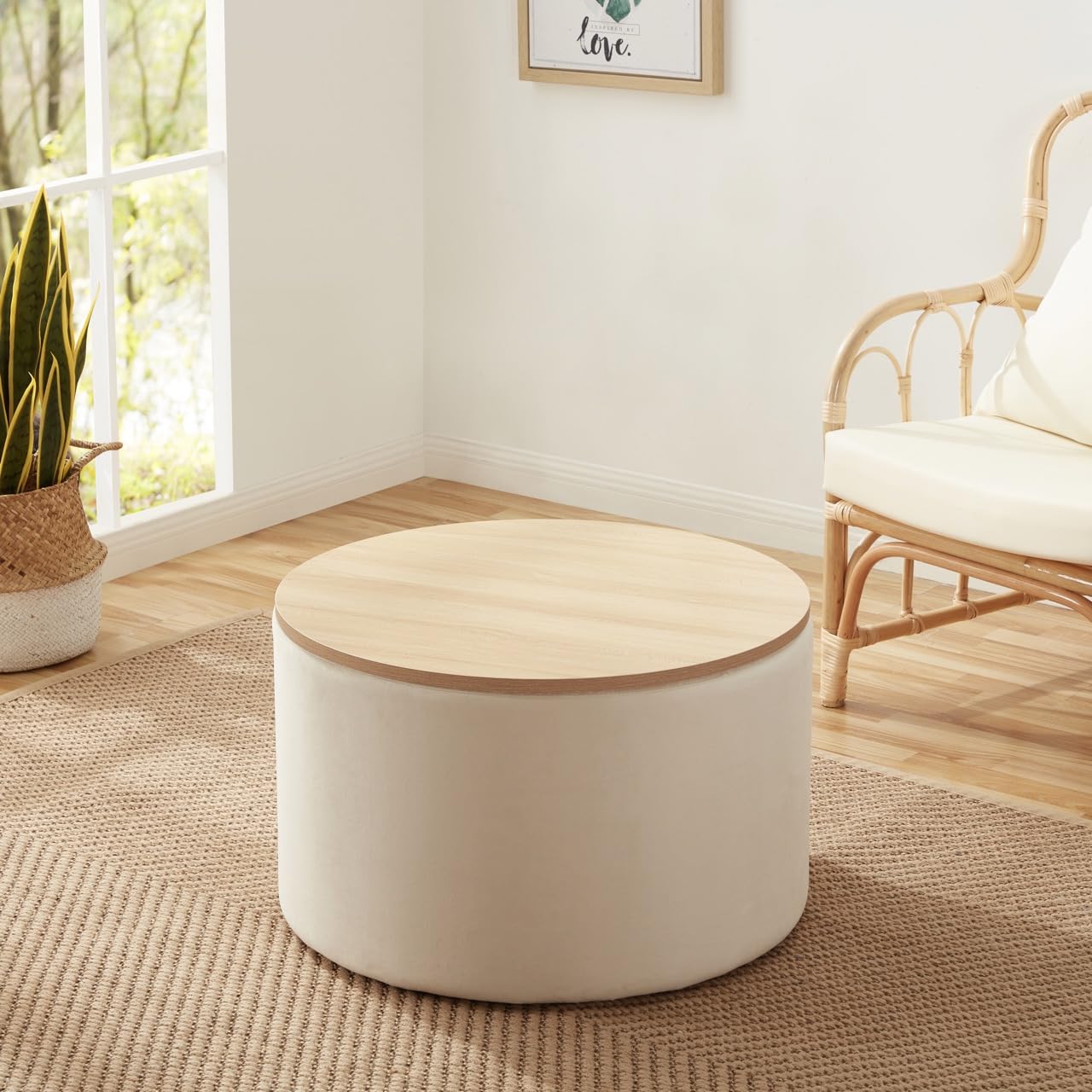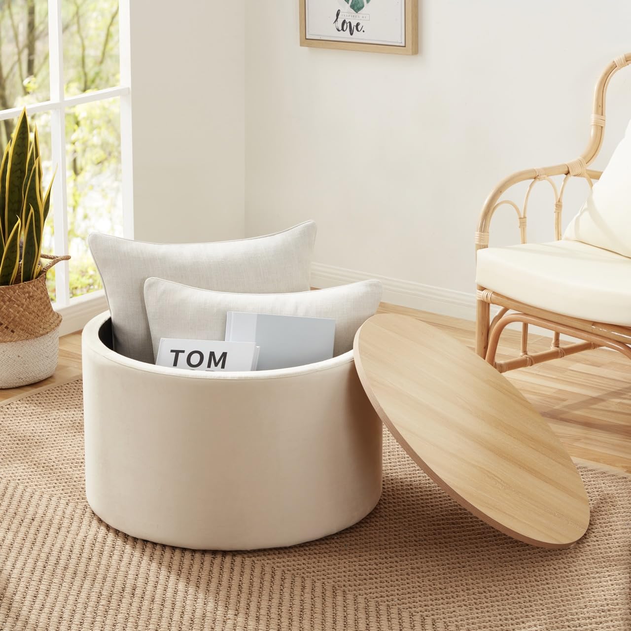 Ornavo Home 22 inch Large Round Ottoman Coffee Table Storage Ottoman with Wooden Lift Off Lid, Ottoman with Storage for Living Room, Bedroom and Office, Velvet Cream