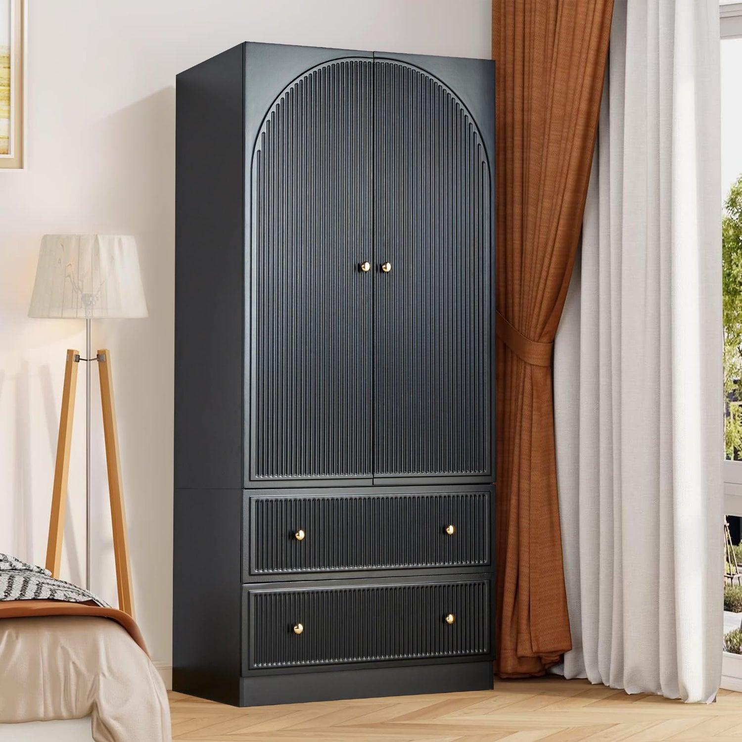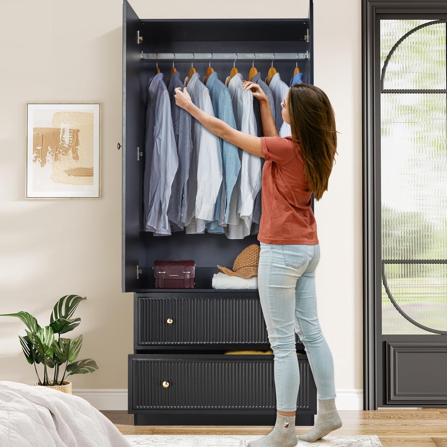 ORRD Black Freestanding Armoire Wardrobe Closet with 2 Doors and 2 Storage Drawers, Large Capacity Wardrobe Cabinet, Wooden Closet for Bedroom