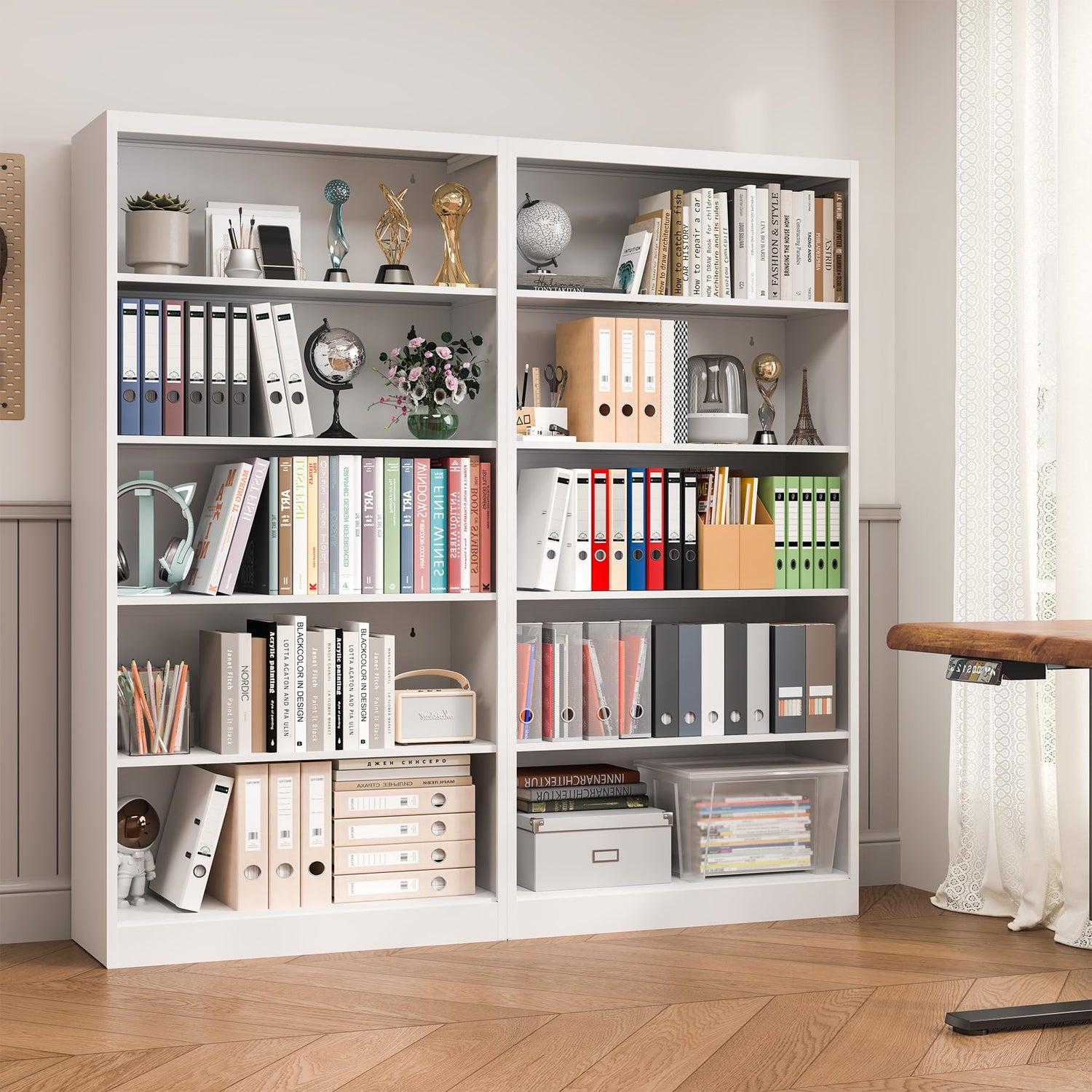 - 【Adjustable Shelves】This 5 Tier bookcase has four adjustable shelves.You can adjust the height according to the storage level.As a white bookshelf, this is our very distinctive design.You can also use this bookshelf as a 6-layer book shelf, and the top can also put your favorite books