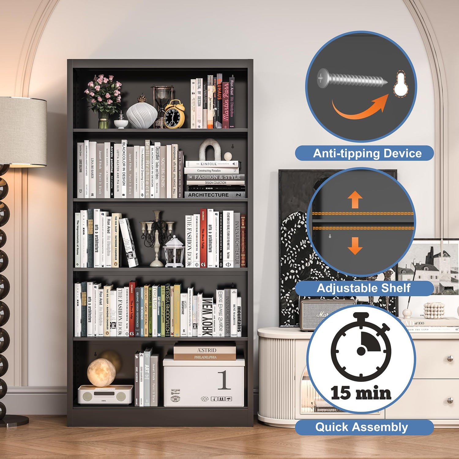 - 【Spacious & Versatile Design】This 66" tall, 5-tier metal bookcase offers ample storage space, with a wide 33.3" frame and 14" depth, accommodating up to 160 books. Featuring four adjustable shelves, you can customize the height to fit your unique storage needs, making it ideal for organizing books, decor, office supplies, or even larger items like binders and boxes.