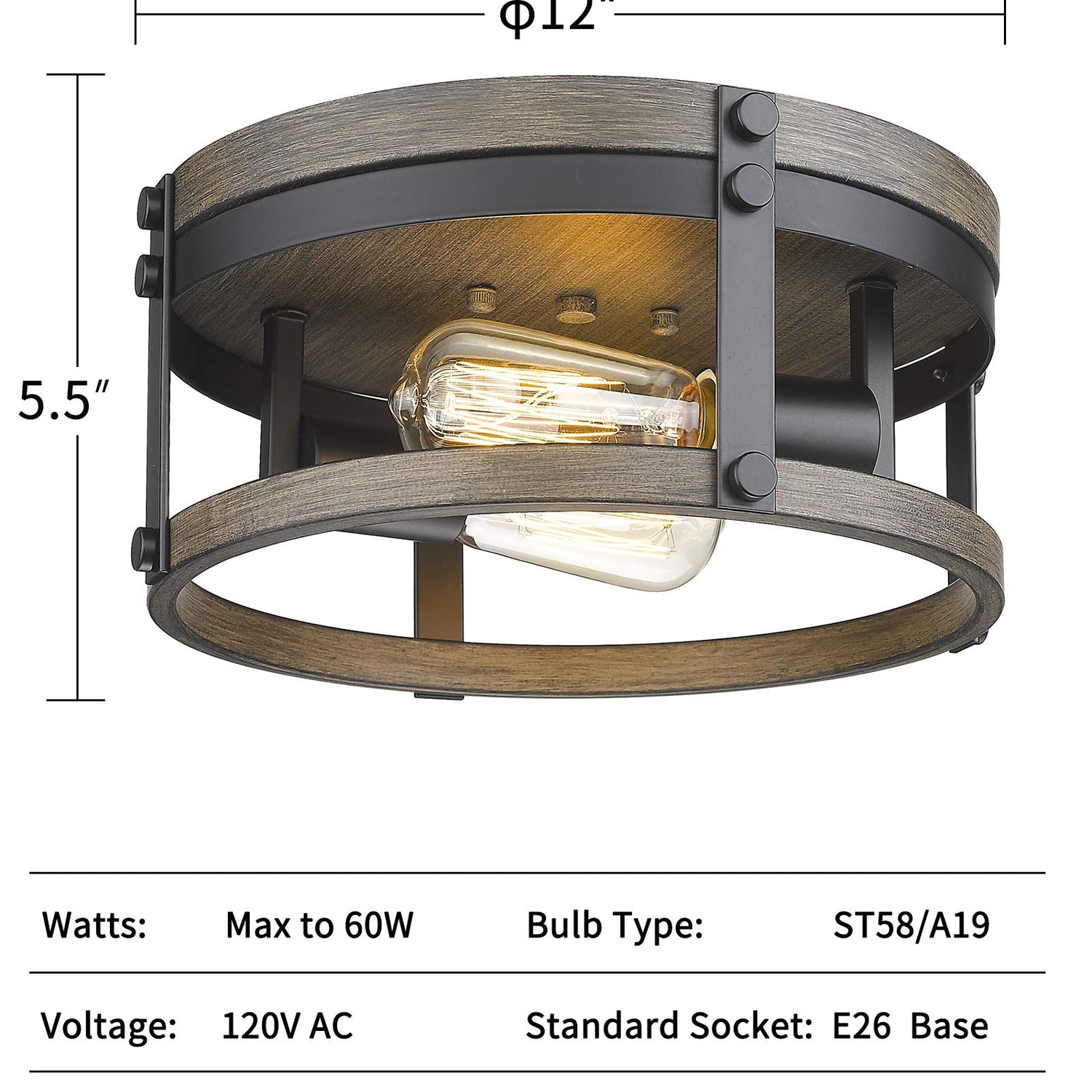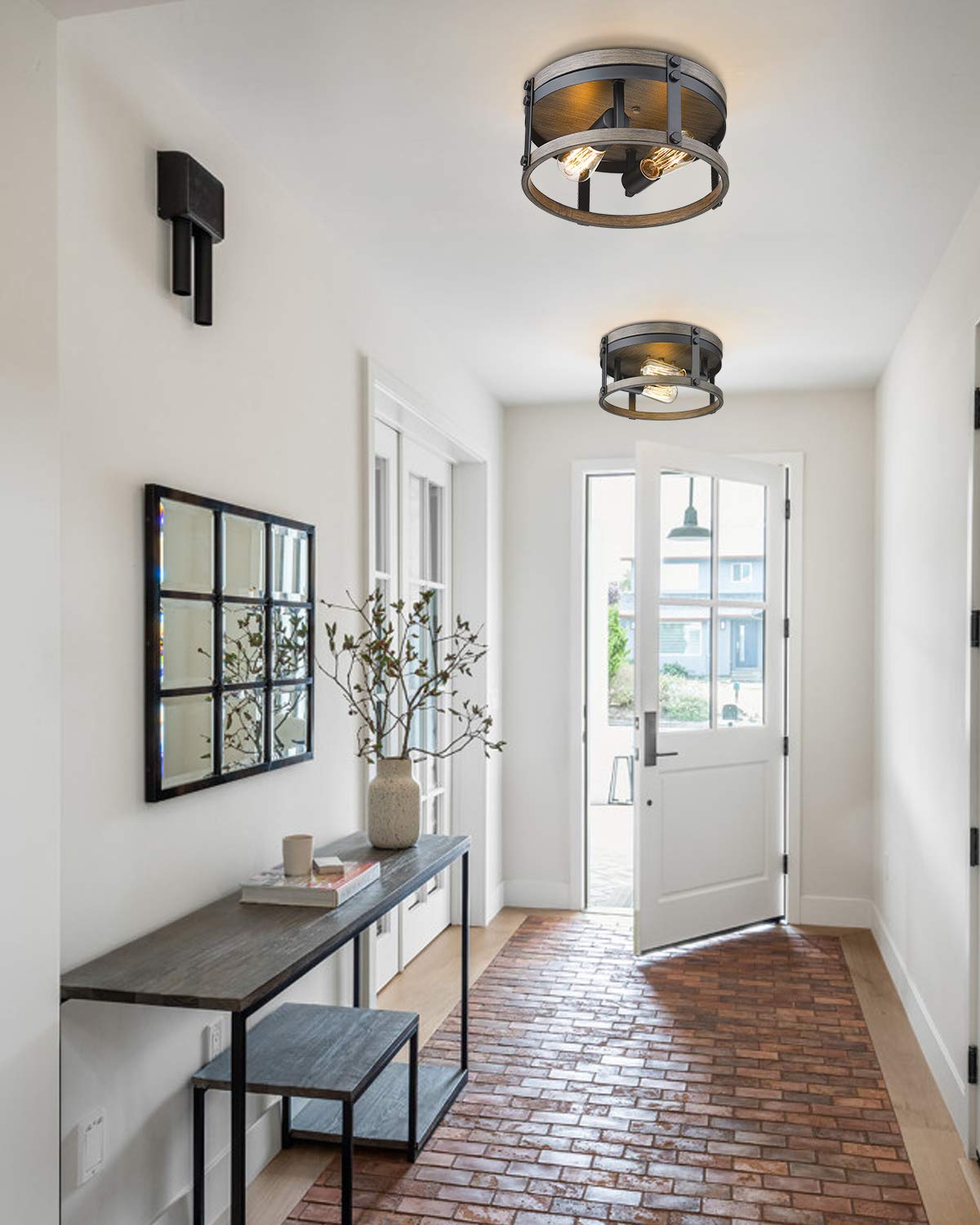 - 12inch Flush Mount Ceiling Light - This farmhouse flush mount light fixture in black and wood grain finish which can be easily matched with other home decoration styles.