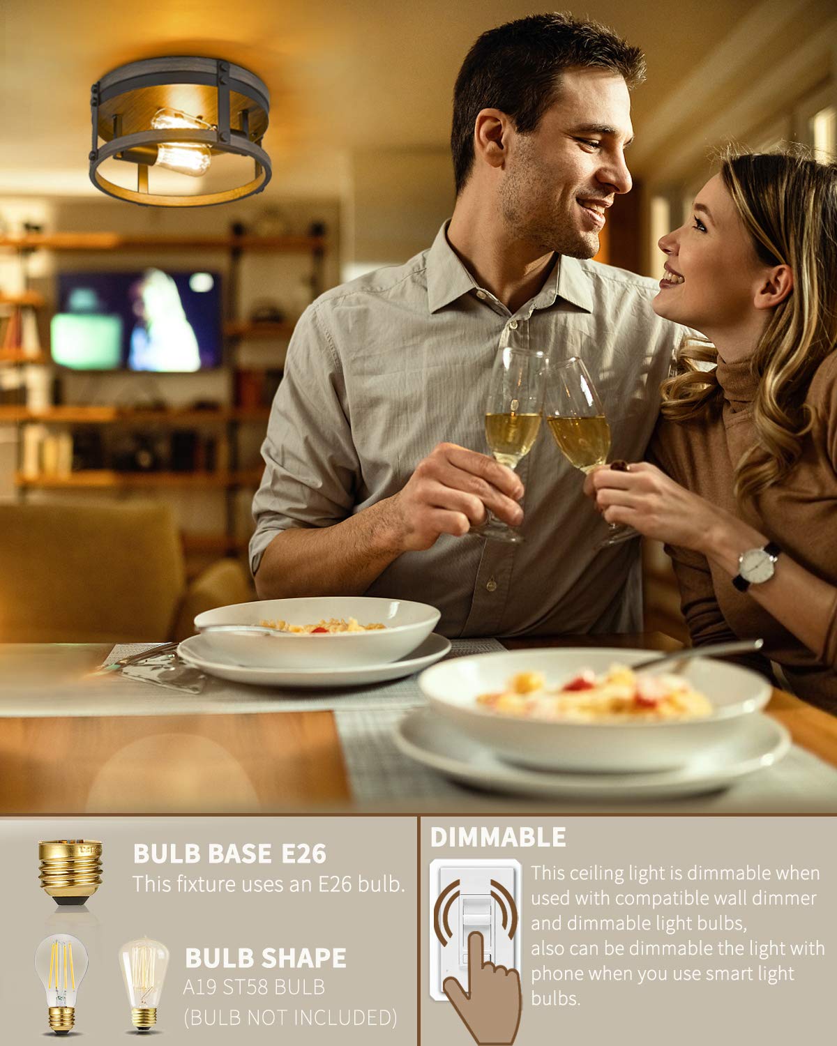 - DIY Your Gorgeous Light Effect: This industrial ceiling lights requires 2 x E26 base bulb(Max.60W). Bulb NOT included. It would be dimmable with dimmable light bulb and dimmer switch.