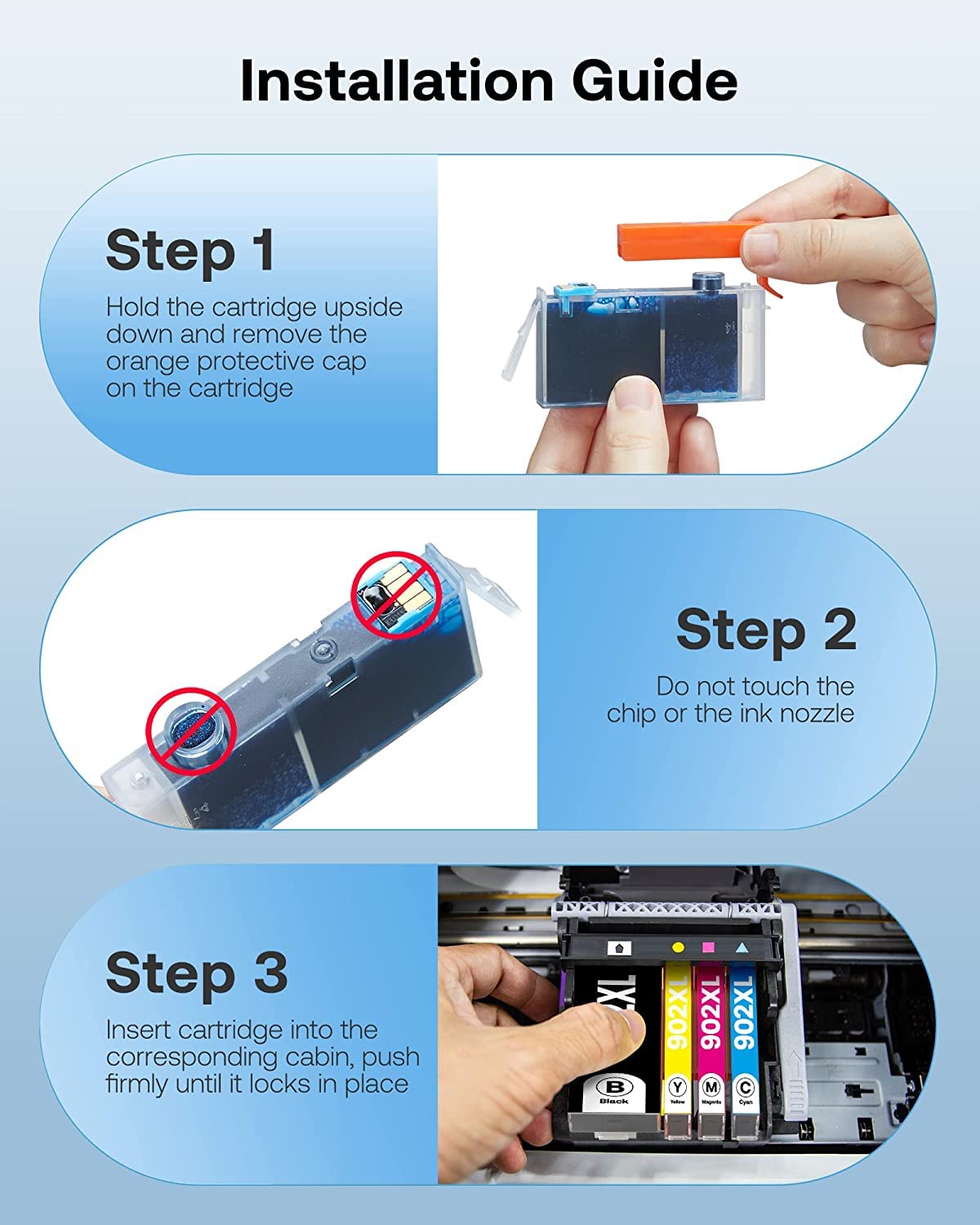 - Latest Upgraded chips: Equipped with latest intelligent chips, undergoes strict quality control, makes sure quick and easy installation and instant recognization. Available for all firmware version printers that use for 902XL ink cartridges.