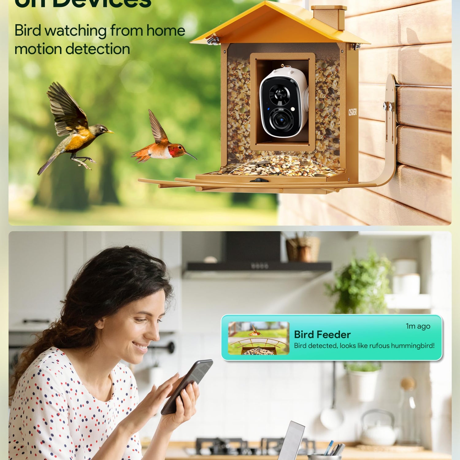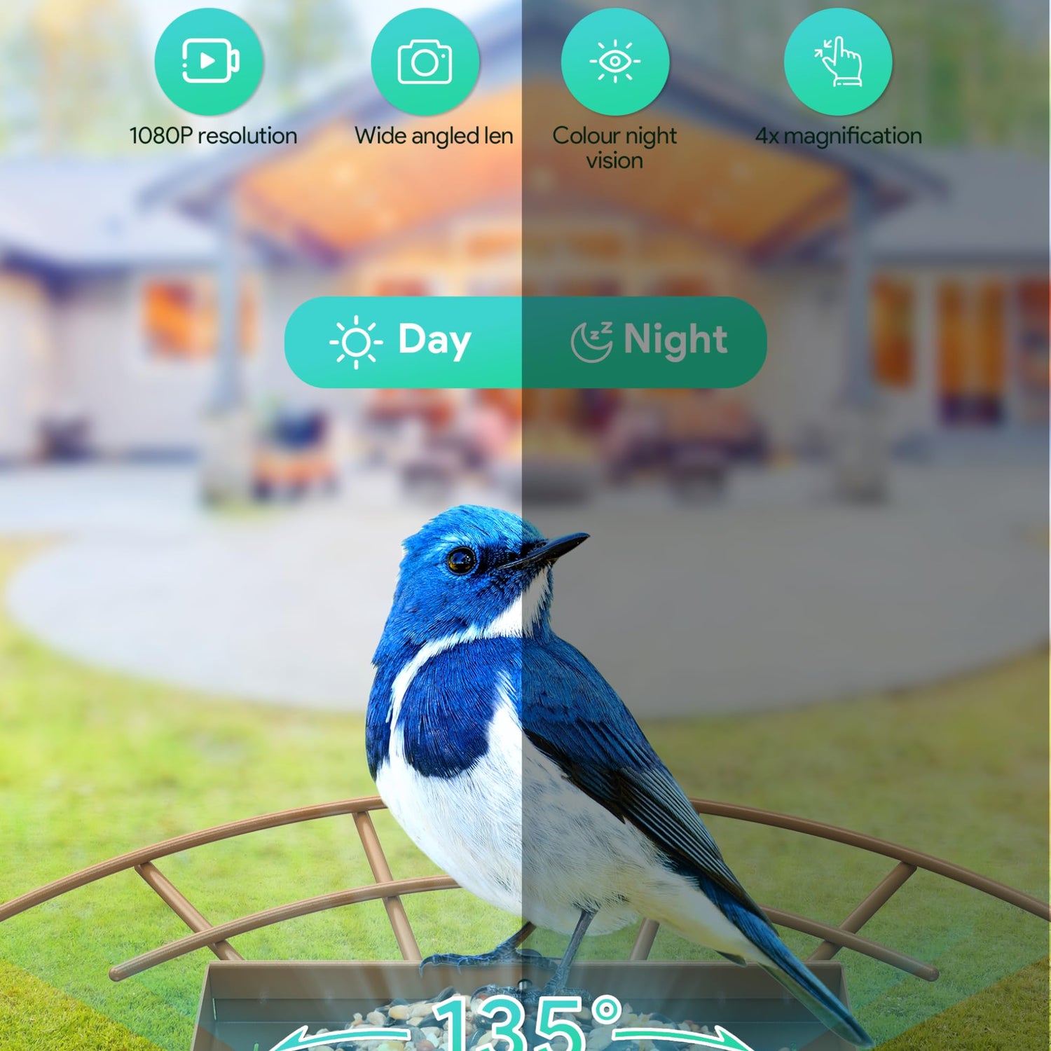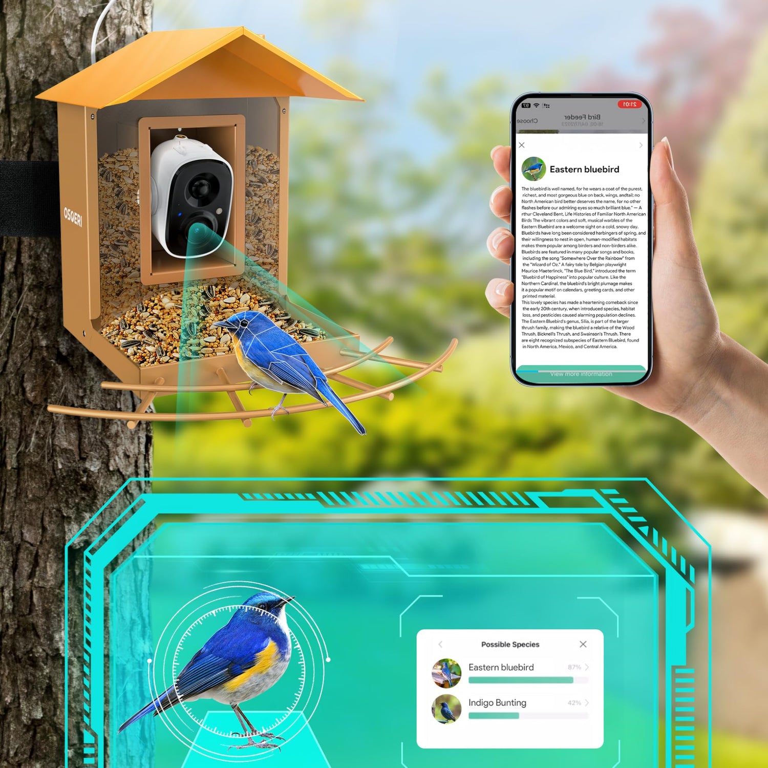 - 🐦【Smart AI Identify & 1080P HD Camera】Osoeri smart bird feeder with camera can identify over 11,000 bird species and you can easily learn details about each species through the app, providing exciting wildlife education for all ages. It features a 135° wide-angle lens and 1080p pixels, allowing you to clearly observe a variety of visiting birds during the day and night.