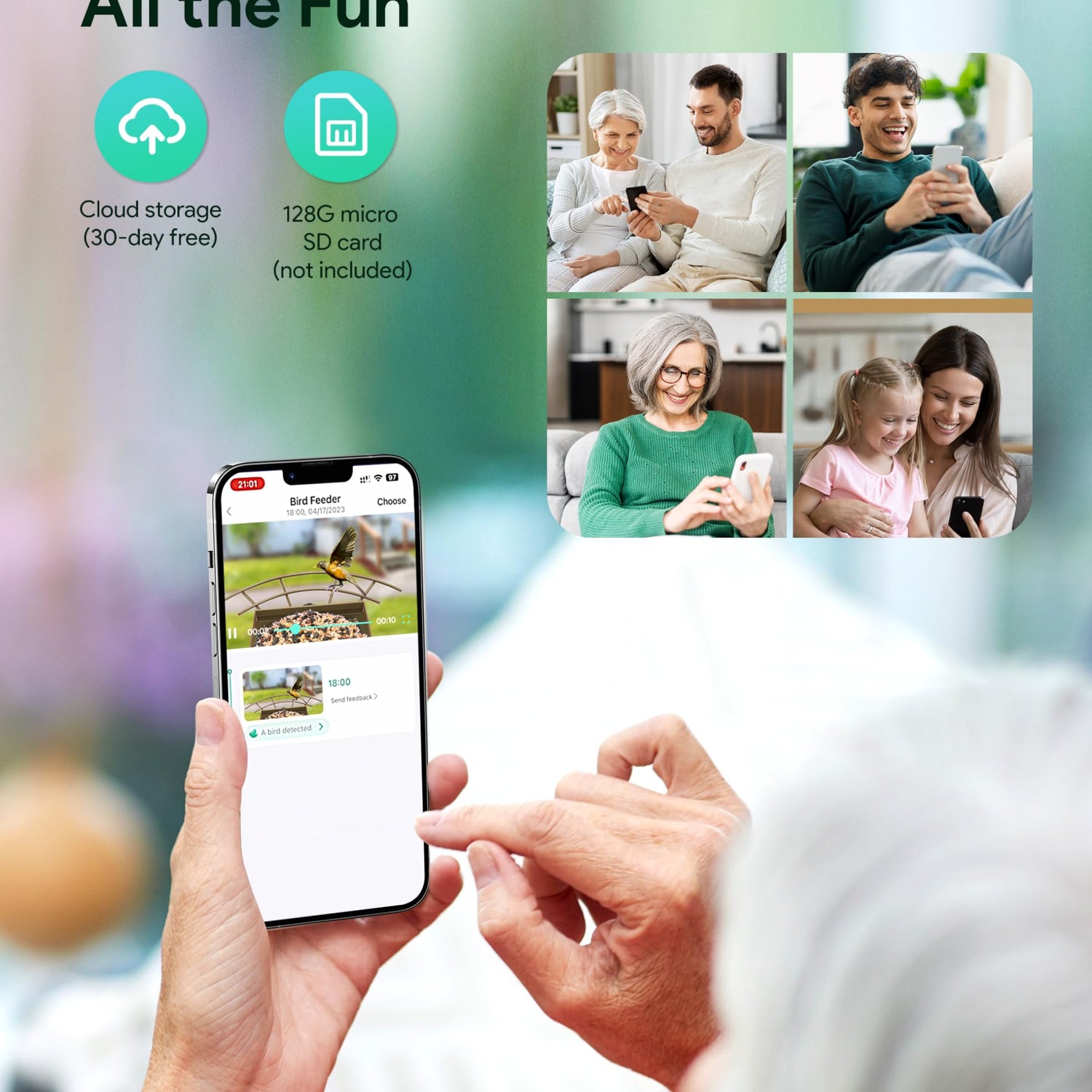 - 🐦【Free Storage & Ideal Gift】This smart bird feeder can store bird videos and pictures in the cloud for free for up to 30 days, and you can extend the storage time by subscribing or storing it in a TF card (not included). You can easily share your device with friends and family or share live video to social media to increase communication. This is a great birding gift for kids, parents and bird lovers.
