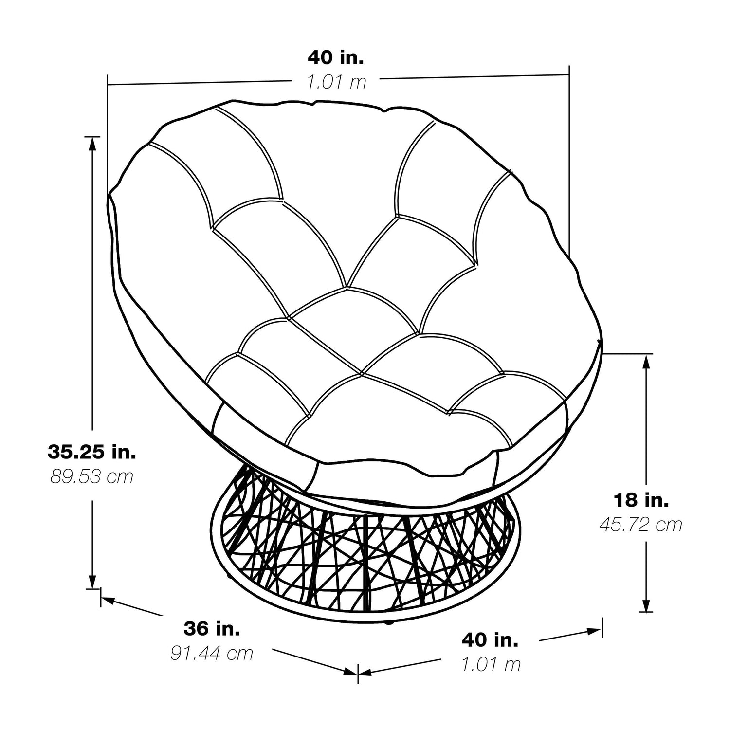 - Overall Size: 40” W x 36” D x 35.25” H; Seat Size: 40” Diameter x 4.5” T; Back Size: 40” W x 18” H x 4.5” T
