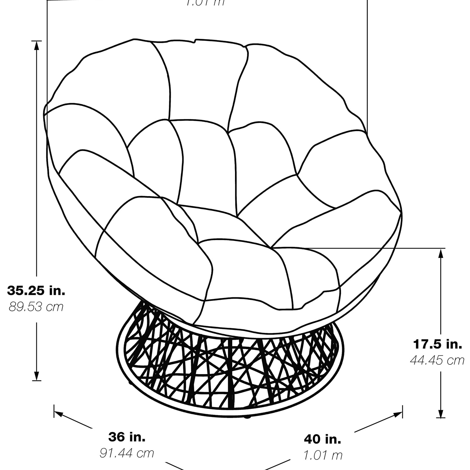 - Overall Size: 40” W x 36” D x 35.25” H; Seat Size: 40” Diameter x 4.5” T; Back Size: 40” W x 18” H x 4.5” T