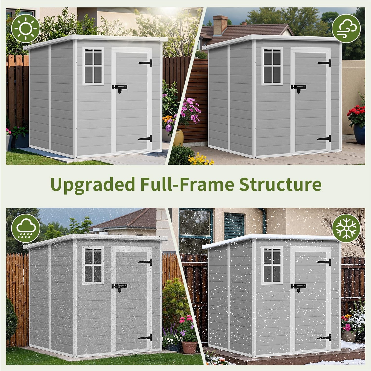 - All-Weather Durability Built to Withstand the Elements : Engineered for year-round reliability, this Osparple shed features advanced weather protection to keep contents safe in any climate. The sloped roof design efficiently drains rainwater and supports a 15 PSF snow load, preventing water damage and structural stress. UV-resistant resin shields the shed from sun fading, while the double-wall construction defends against 30 MPH winds—perfect for coastal areas or windy regions.