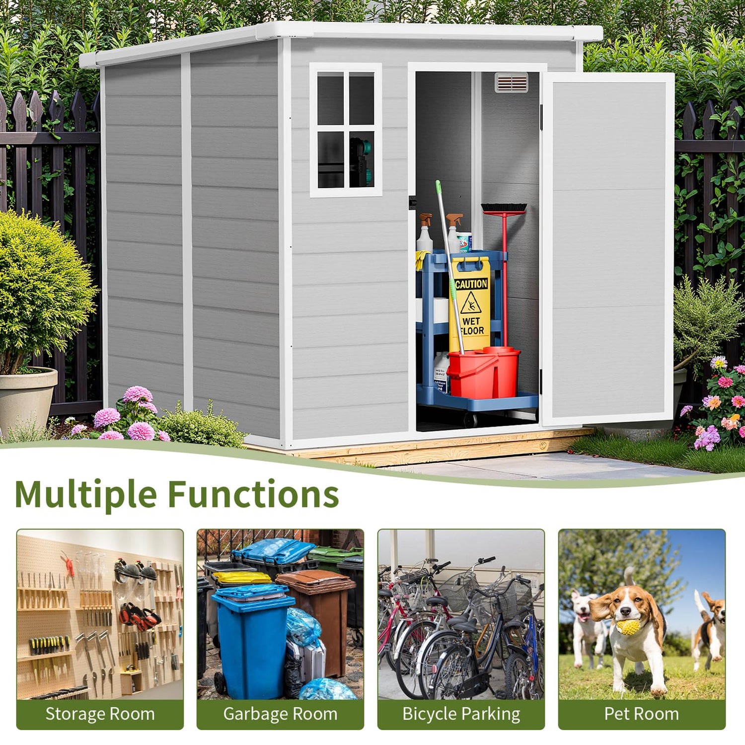 - Versatile Multi-Purpose Solution for Every Outdoor Need : From bike storage to pet shelters, the resin shed adapts to endless uses. Use it as a "bicycle shed" for mountain bikes, scooters, and helmets; a "tool shed" for lawn equipment and garden tools; or a "pool supply organizer" for floats, chemicals, and accessories. Its neutral gray color and wood-look exterior blend seamlessly with patio decor, making it a "decorative storage shed" for outdoor spaces.