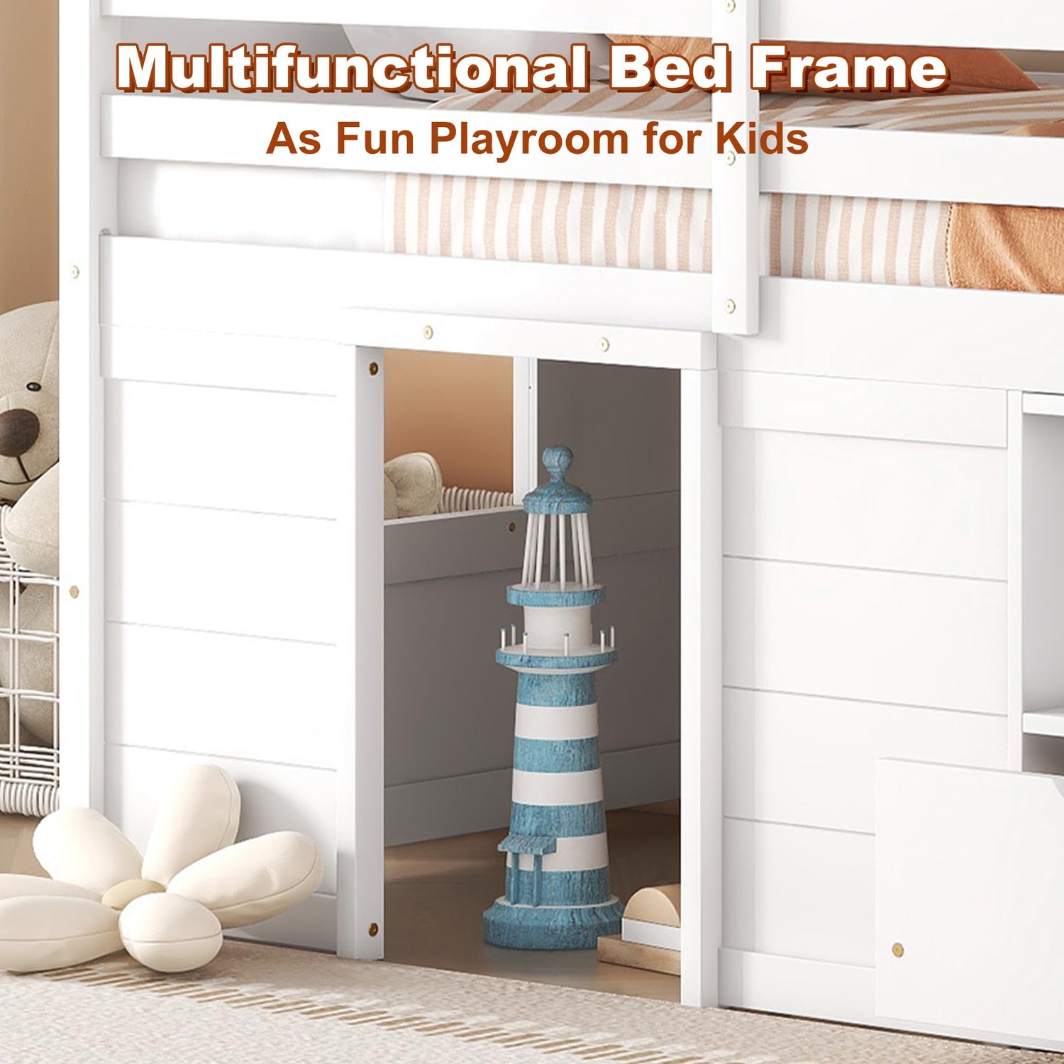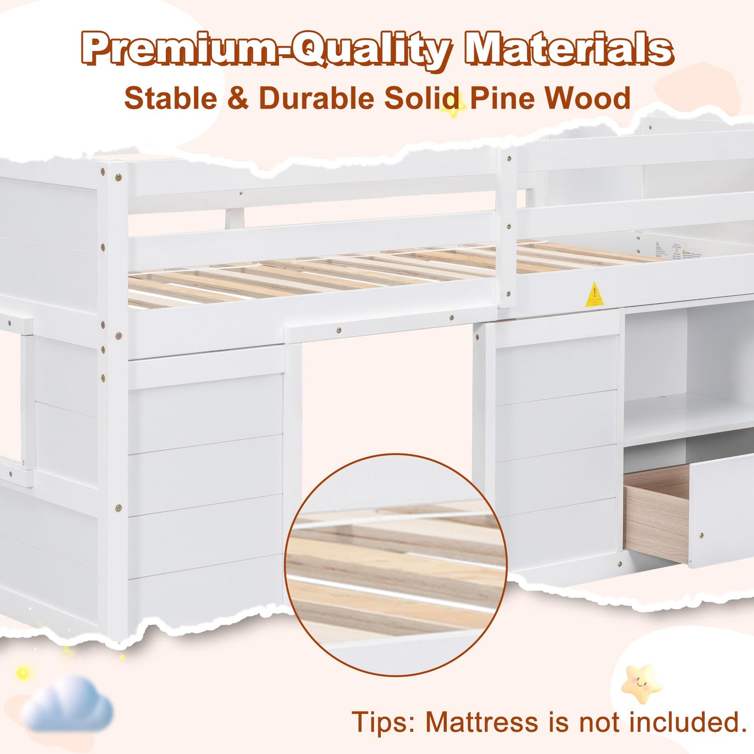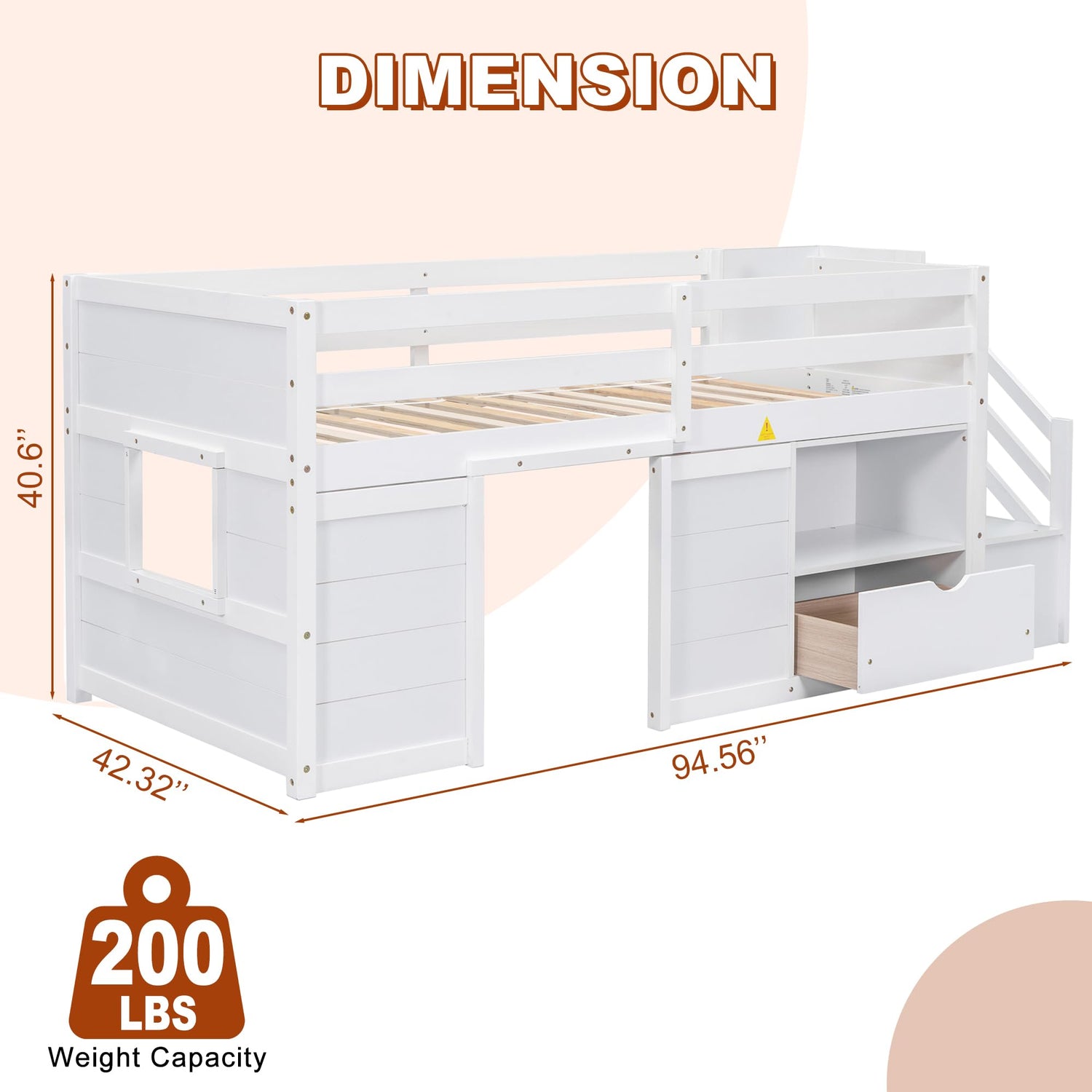 Osparple Twin Size Low Loft Bed, Kids Bed Frame with Shelf, Drawer and Stairs for Girls, Boys, Loft Bed with Storage, Strong Wood Slats Support, White