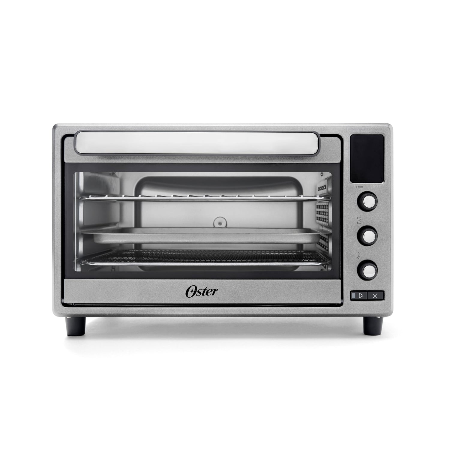 Details: Make appetizers, snacks, meals, and more with the Oster® Compact 10 Function Air Fryer Oven. Boasting ten cook functions: air fry, bake, broil, defrost, dehydrate, pizza, roast, tender roast, toast and warm, this countertop oven takes the place of multiple kitchen appliances. The low-temp TenderRoast™ function: delivers fall-off-the-bone tender results for meat, poultry and more. Designed with additional heating elements and a perforated interior for improved air fry performance for the crispy finish you love with 99.5% less oil than traditional deep fryers. This toaster oven air fryer features a roomy 26 Qt. (25L) capacity that can fit a whole roast or a 12-inch pizza, while still taking up minimal counter space. Fully digital display for effortless functionality and ease of use. Includes four essential accessories: baking pan, crumb tray, wire rack, and air fryer mesh rack make it easier to cook and to clean up when you're done. Cook faster, healthier, and better than ever with the Oster® 10 Function Air Fryer Oven.