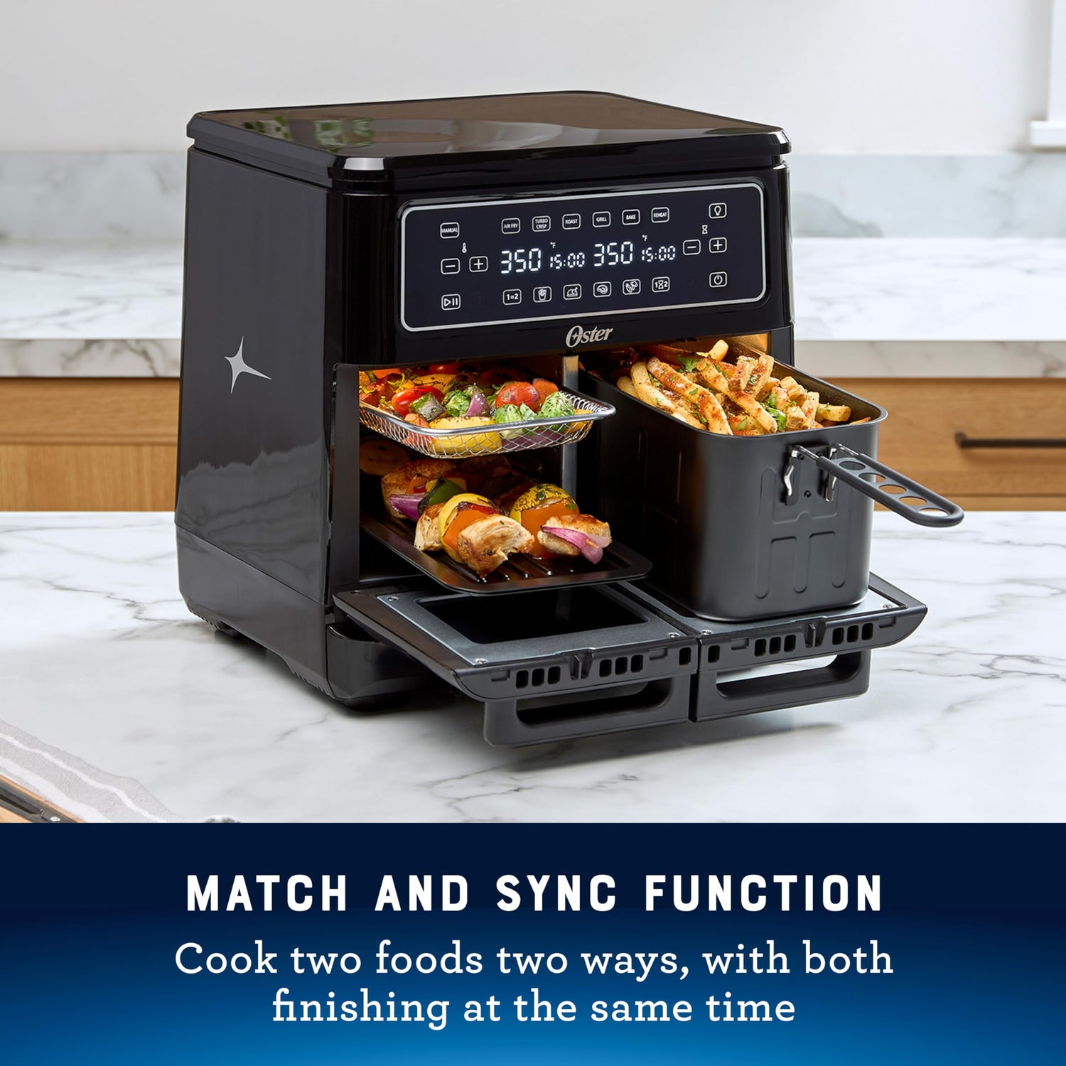 Details: Ready for a new way to make family-size meals faster, easier, and tastier than ever before? The Oster Flex Air Fryer Oven features multiple cook functions, letting you air fry, bake, grill, reheat, roast, and turbo crisp with one essential kitchen appliance. Two temperature independent 5.5-quart (5.5 L) zones function like two mini ovens. Cook food in both zones at the same time and temperature; or use the Match and Sync Function to cook two foods two ways, with both finishing at the same time. Plus it features a glass window, so you can monitor food while it cooks.