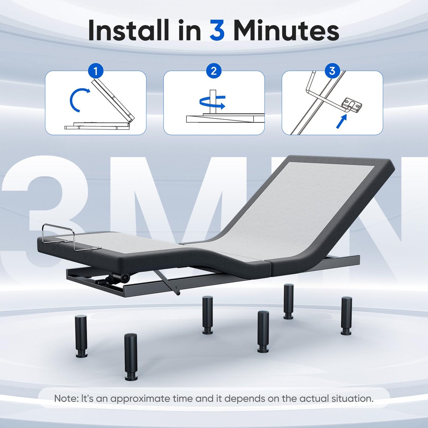 - 【Install in 3 Minutes】The electric adjustable bed frame can be easily installed without any experience or tools. It just requires a few simple steps, including installing adjustable bed legs, mattress retainer bar, and connecting power sources in 3 minutes!