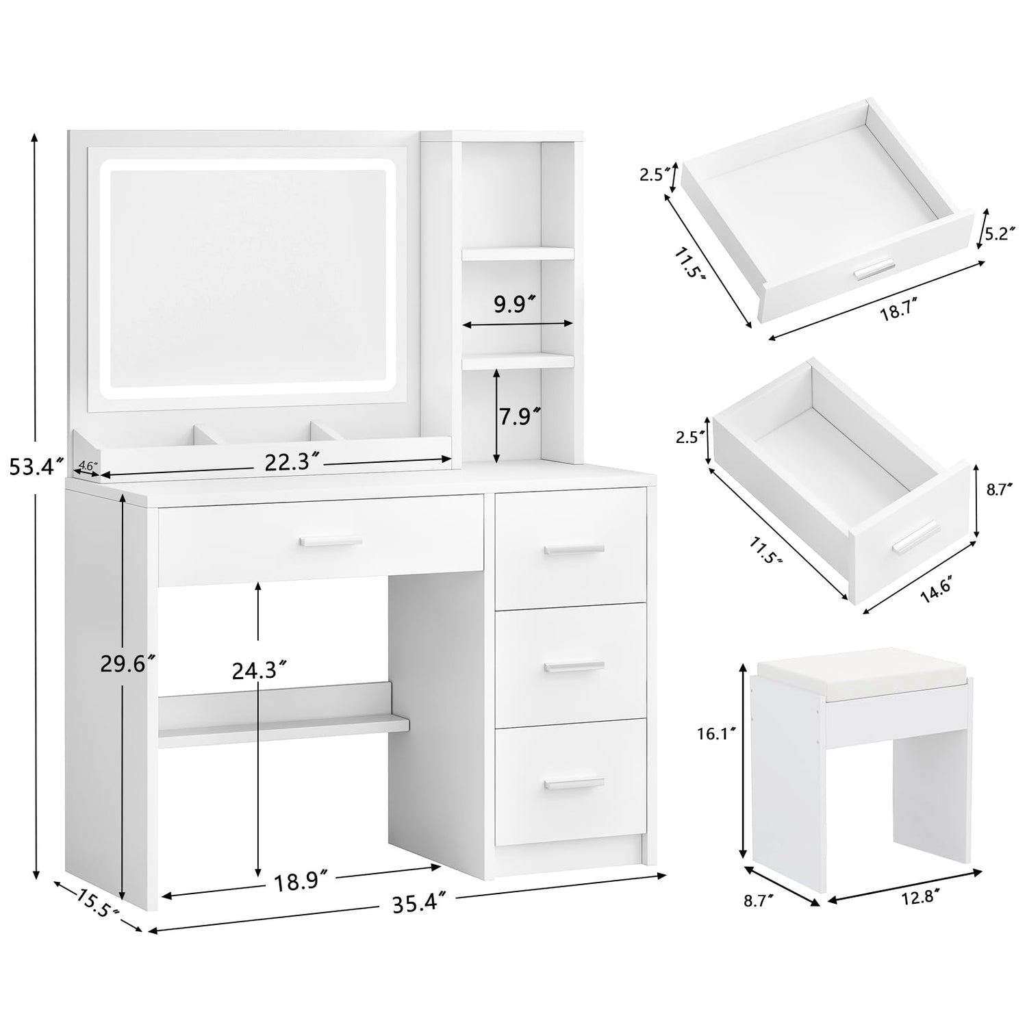 - Multiple Storage Spaces: 4 large drawers, 3 shelves, and a wide tabletop give you a great styling station! All the open and closed storage spaces allow you to easily organize all your makeup and all of your accessories. With its sleek design, the dressing table also adds an elegant touch to your room.