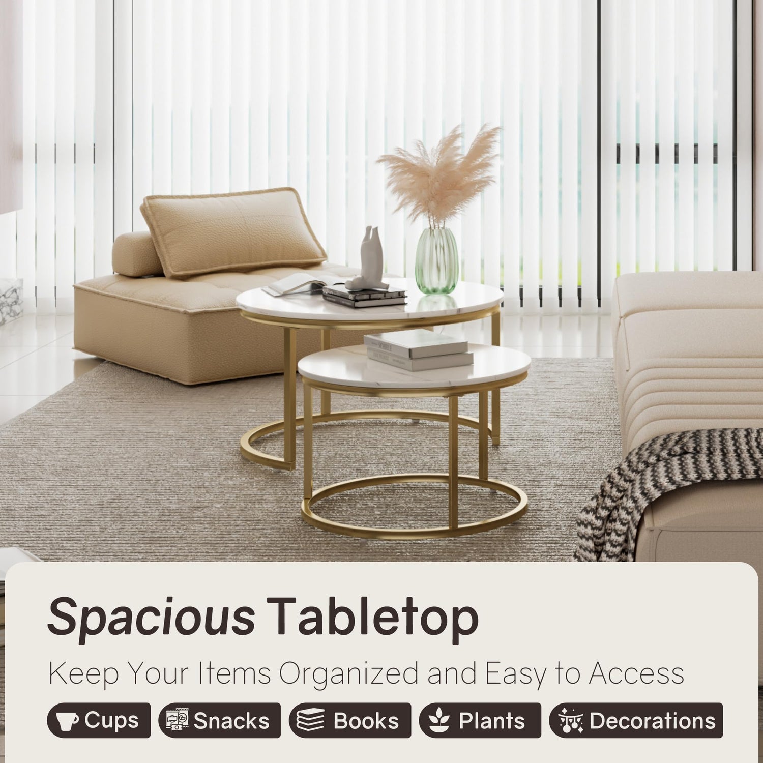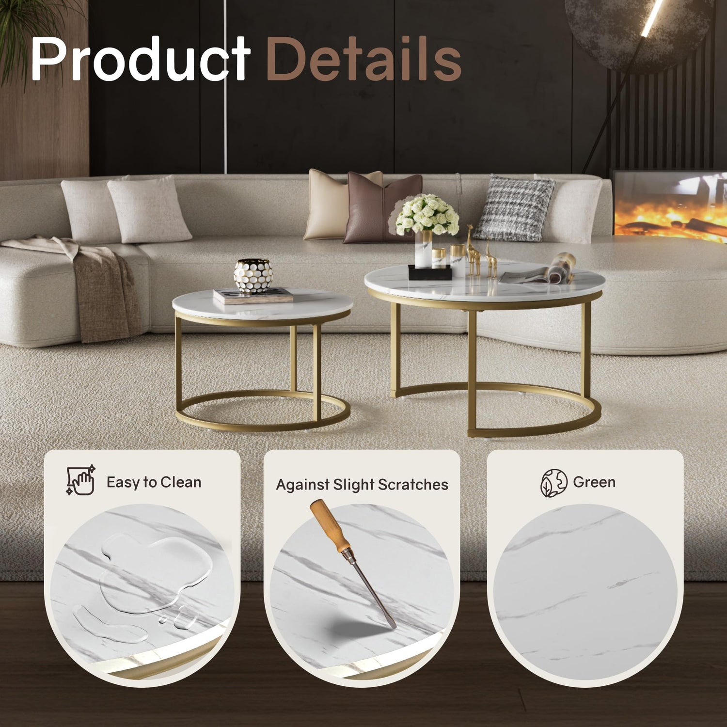 Otterease Nesting Tables Set of 2, 31.5" Round Coffee Table, Small Nesting Coffee Table with Adjustable Non-Slip Fee, White Marble Top Stack Nesting Tables Set of 2 for Living Room, Bedroom (White)