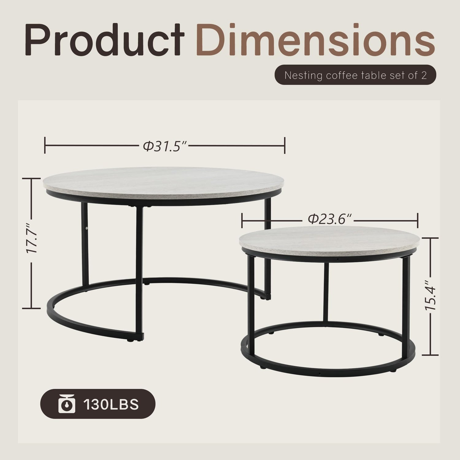 - 【Space-Saving Nesting Coffee Table Set】This set features a large round coffee table (Φ 31.5x17.7 inches) and a small end table (Φ 23.6x 13.2 inches). The small table conveniently nests under the larger one, saving valuable space in your living room or office.
