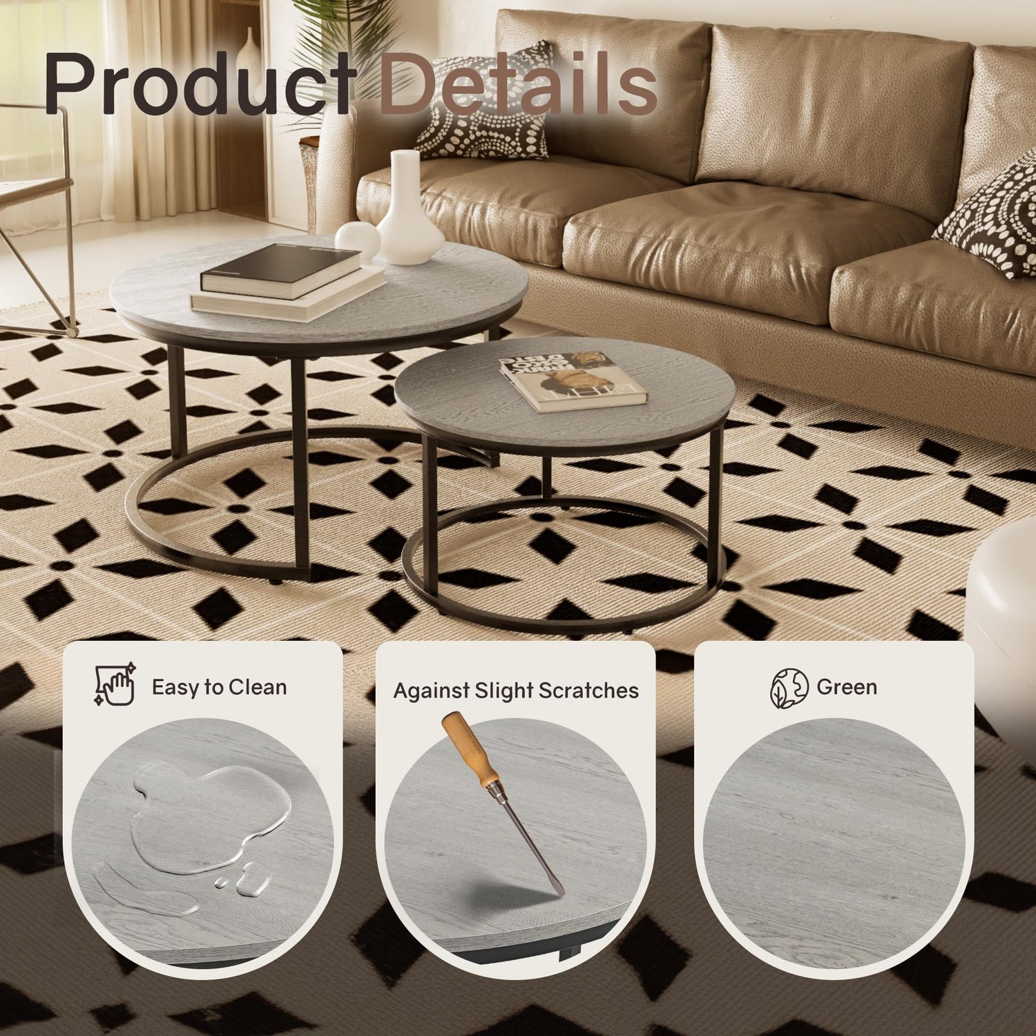 Otterease Nesting Tables Set of 2, 31.5" Round Coffee Table, Small Nesting Coffee Table with Adjustable Non-Slip Fee, Wood Grain Top Nesting Tables for Living Room, Bedroom (Wood Grain Grey)