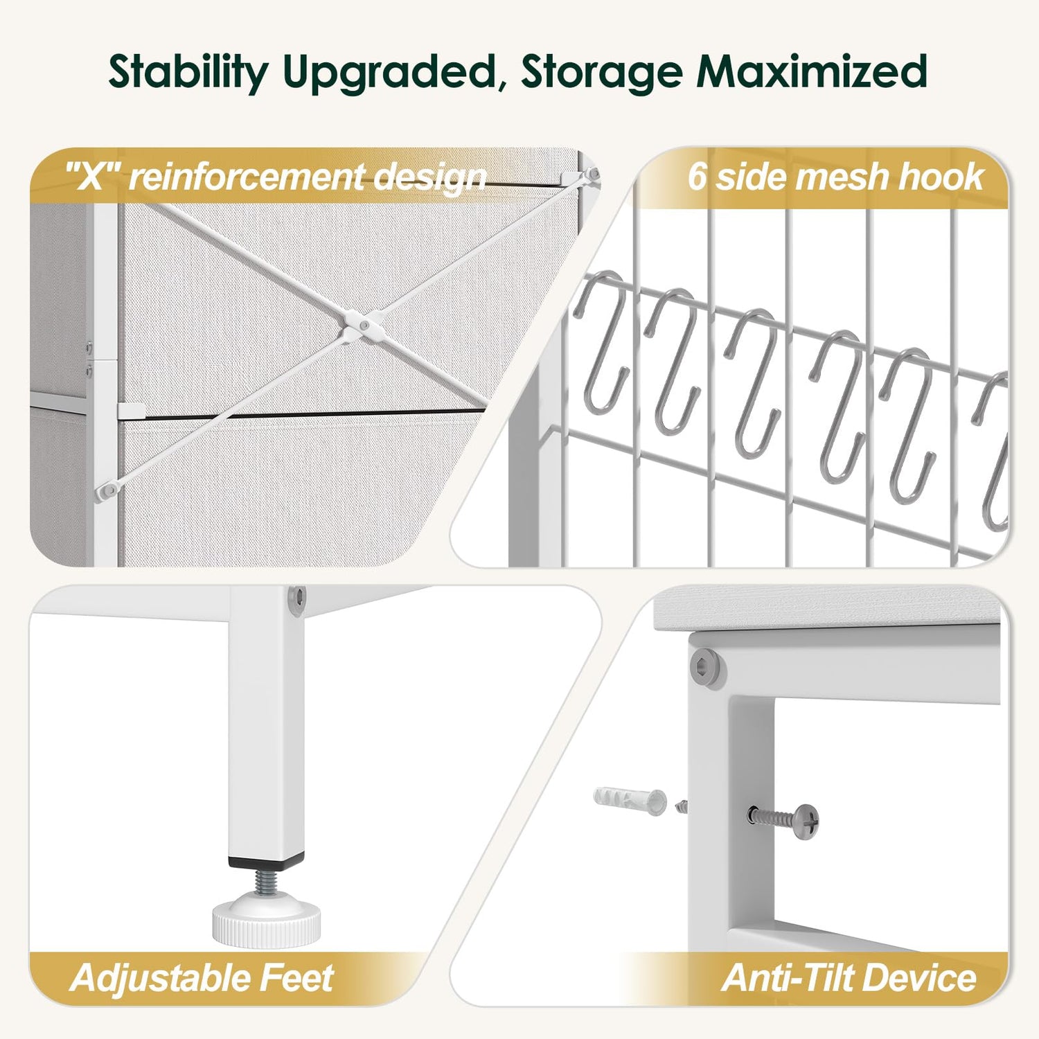 - ๐๐ฎ๐ฉ๐๐ซ ๐๐ญ๐ฎ๐ซ๐๐ฒ & ๐๐ญ๐๐๐ฅ๐ ๐๐จ๐ง๐ฌ๐ญ๐ซ๐ฎ๐๐ญ๐ข๐จ๐ง: Safety first, especially with kids and pets around. This dresser with hanging rack comes with anti-tip hardware that anchors it firmly to the wall, so little ones canโt yank it over while climbing or pulling drawers. The adjustable feet level it out on uneven floors, eliminating wobbles that might scare pets or trip busy parents. Built with a thick, durable frame and high-grade boards, it handles daily use, from kids rummaging for socks to pets napping on the shelf. Solid, secure, and designed to keep your family safe. This dresserโs built to last, and to protect what matters most.