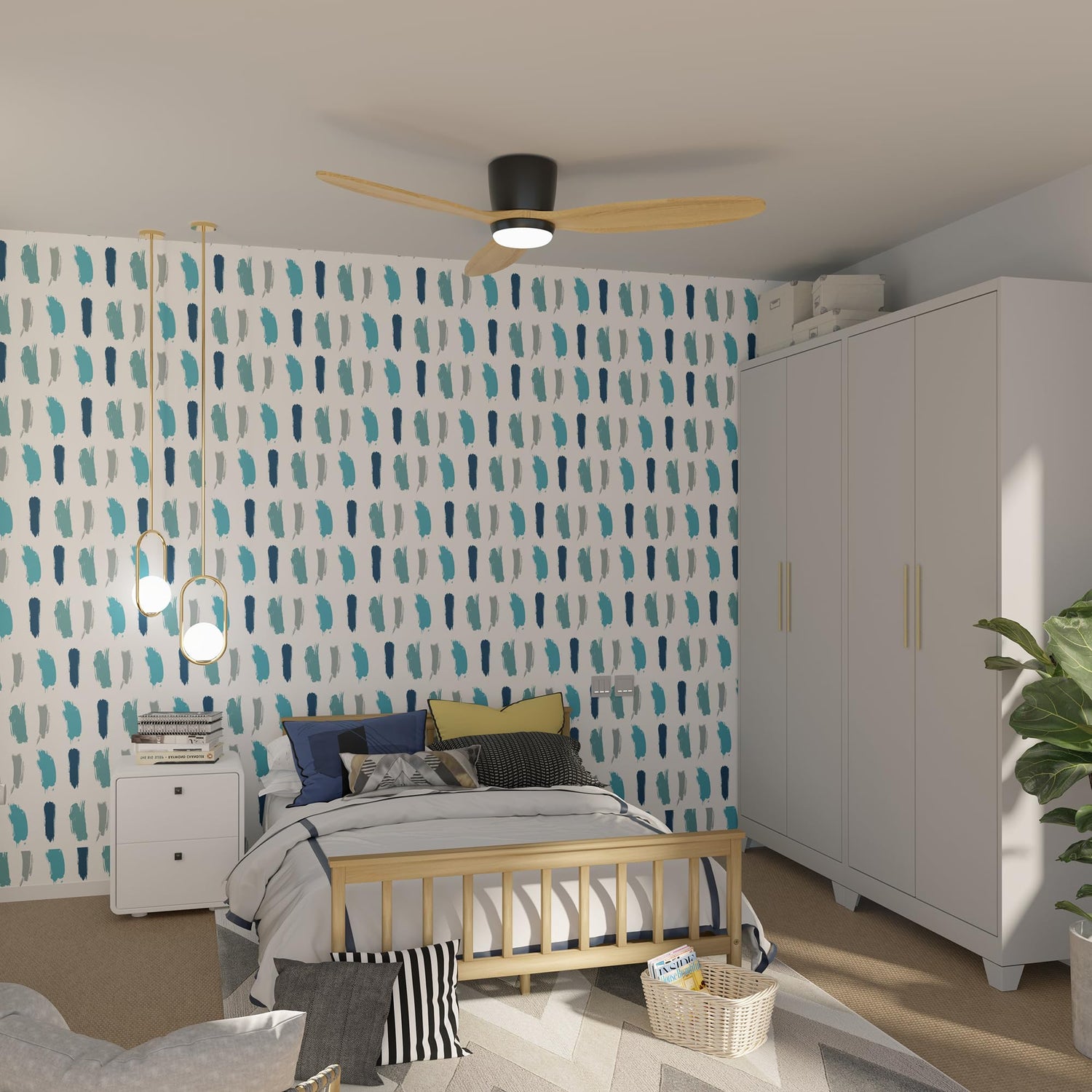 OUATER Flush Mount Ceiling Fan with Light, 52 inch Low Profile Ceiling Fans with Remote for Outdoor/Patios, 3 Color Light, 6 Speed, DC Motor, Wood and Modern Matte Black