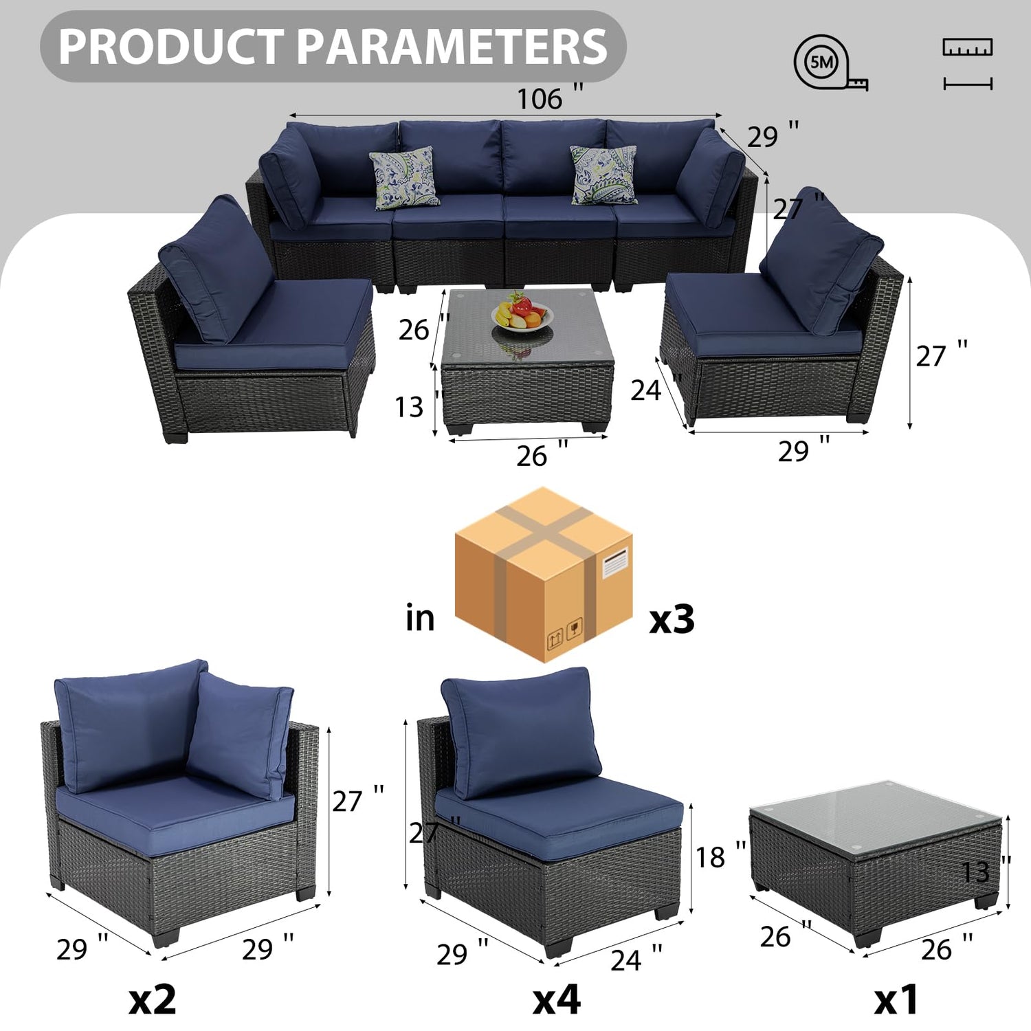 OUGMMGOU 7 Piece Patio Furniture Set, All-Weather Wicker Outdoor Conversation Set with Sectional Sofa, Rattan PE Wicker Seating, Glass Coffee Table, and Cushions (Coffee-Dark blue, Z7)